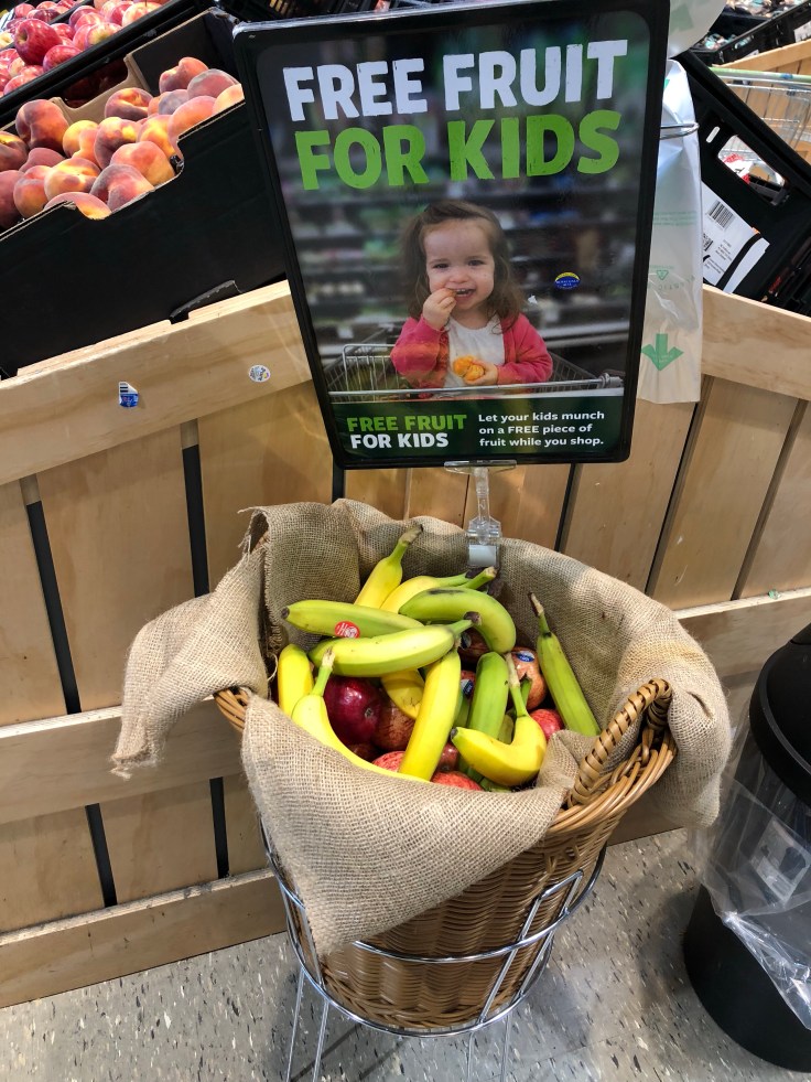 Another thing I can’t leave out that I LOVED about their grocery store, they had free fruit for kids to eat while you shop AND candy-free check-out lanes as options to stave temptations!