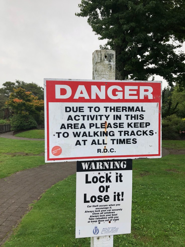 After Wai-o-Tapu I headed back into town and went to Kuirau Park. At first glance, Kuirau just looks like a regular lush grassy park with some gardens in the middle of the town. Until you notice all the signs “Danger! Thermal Area!” And “Danger! Keep on walking path due to thermal activity!” And sure enough, once you look around, there are little fenced off areas throughout the park, some no larger than 4 ft square, with steam vents pushing out of the ground! They also have warm spring foot baths in the park. After logging a couple more miles at least at Wai-o-Tapu that sounded amazing. I found one of the baths, took my hiking shoes off, and slid my feet right in. The warm water felt amazing on my feet and calves. But then it started to get busy, a large group came over and I saw some ugly feet. I hate feet. And then I started thinking about god knows what’s on those ugly feet. And god knows what’s in the water. So that was the end of that.