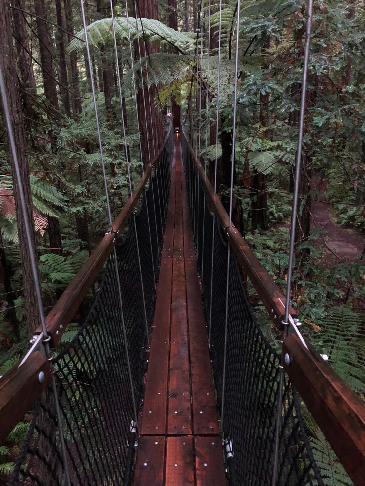 After spending about five hours on geothermal exploring I figured it was time for a change of scenery so I made my way to the Rotorua tree walk. A network of cable bridges hanging from redwood trees high above the forest floor. I had seen pictures and knew that night was the most beautiful as you could do the course after dark and they illuminated parts of the forest and had large beautiful wooden carved lanterns amongst the trees. It was after 6 so I figured dark would be descending soon and it was a good time to go. Wrong. I started about 6:45, the whole thing really should’ve only taken me 20 minutes and realized that I was too early, it was still light out. Forgot about that whole being summer part. Normally I am not the kind of person to read all the educational signs but this time I had time to kill so by god I read and re-read and contemplated every informational sign I came across. And I actually learned a lot. There is a lot of California in that forest! Apparently Sequoias and Radiata pines are main trees used to replenish the forests of New Zealand! Here I was, in freaking New Zealand, standing on a platform tethered to a Giant Sequoia!