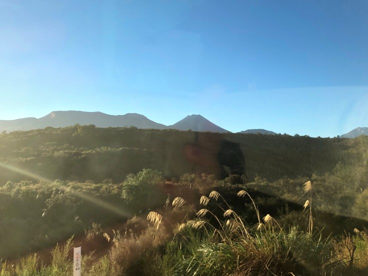 After about ten minutes I started to make my way to the shuttle. What I didn’t realize, is that I had a solid mile trek from where I was parked to the top of the car park where the shuttle would actually pick up! I hauled ass and made it to the meeting point by 6:55am. It was cold enough out that I could see my breath but with a heavy pack on my back (the heaviest I have EVER carried) and scurrying up the inclined path I was already hot and sweating by the time I got there! After about a half hour shuttle ride I made it to the entrance. On the way there I could see the mighty Tongariro and Nguaurahoe starting to show themselves in the cloudy morning.