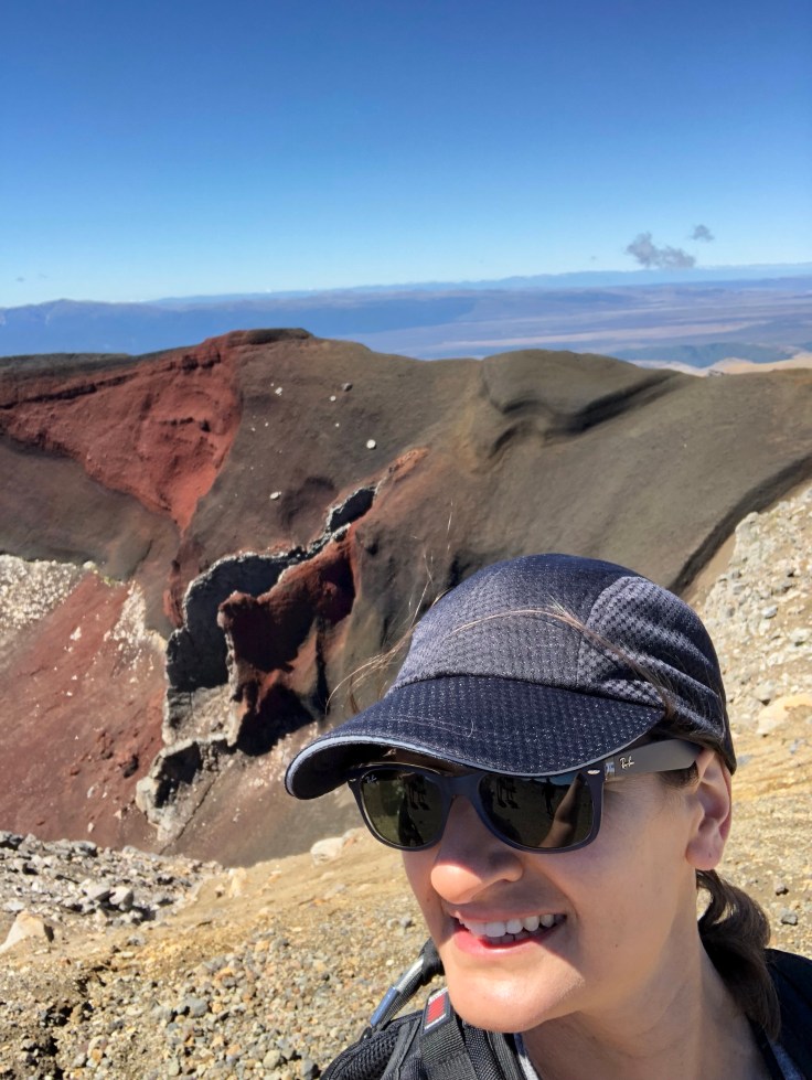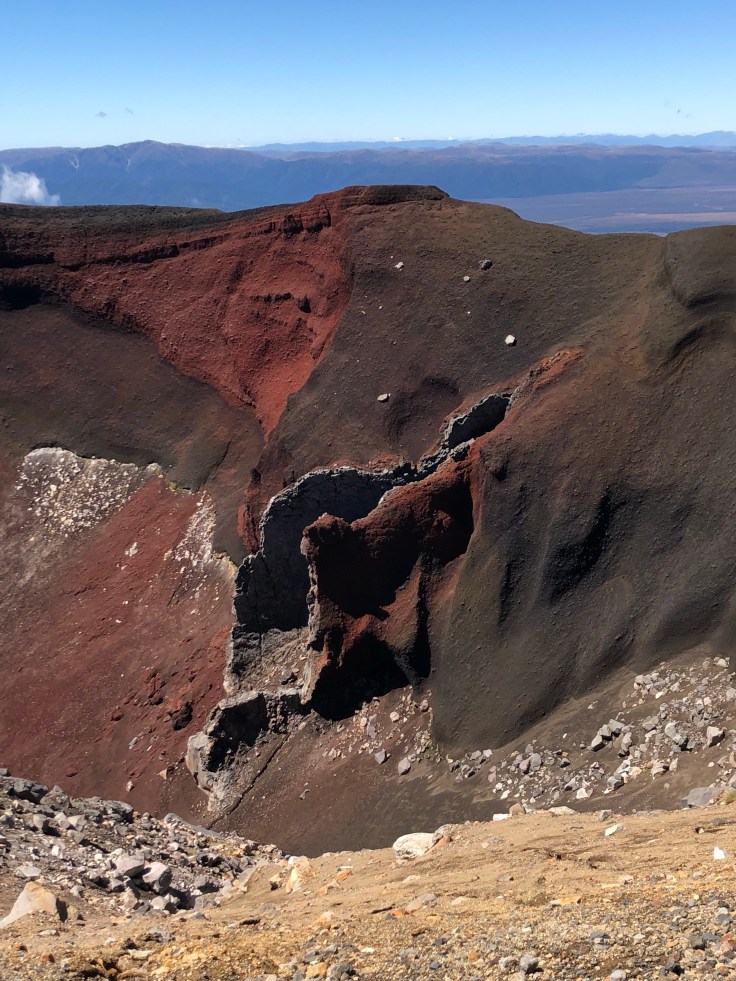 We came to the top of Red Crater, the summit, and to our right, there it was the giant red crater. We were actually standing on the lip of the crater. And I’m not going to lie, the giant fold in the crater kind of looked like lady parts. You know you see it too. We were in awe of this reward. And then we turned around and behind us, there she was, Mt. Nguaurahoe, staring back at us, her Crater smiling down upon us as if it reward us for our efforts. I was in absolute awe. She was stunning. And also inspired the idea for my next tattoo… Kyra was starting to worry about time as the last bus left at 4ish and she was scared to miss it. I wasn’t going to hurry, for one, I physically couldn’t, this hike was draining. And I wanted to soak in every second of it. I told her that she could go on without me and also reminded her that I had a car and promised her that if we were late I would drive her the hour back to Taupo. At some point I actually formulated a plan that we should just count on that and then we could soak in a hot spring at Taupo that evening before I headed back to Turangi. In any case, I didn’t want that moment atop that summit to end. At that point we had ascended over 2500′ feet in elevation. I was on top of the world. And loving every minute of it.