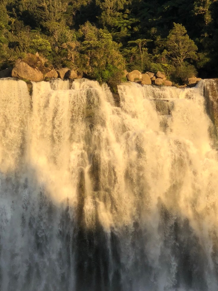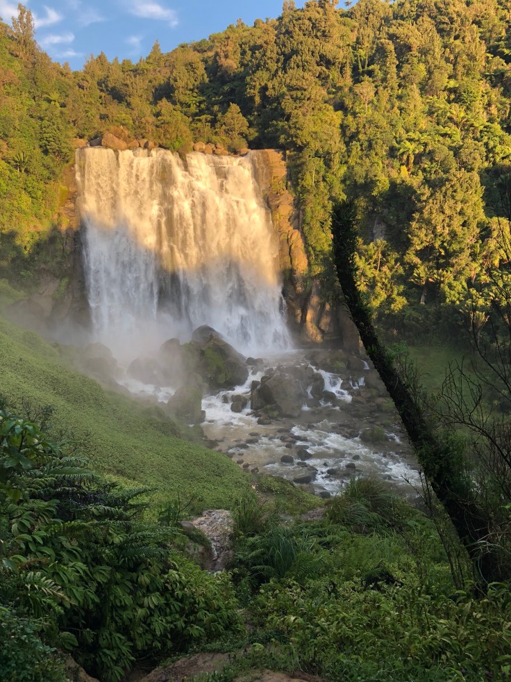 I hopped in the car and started heading the falls direction, only about 15 minutes away. Aside from feeling cheated on the hike, I didn’t mind the extra drive, it’s so beautiful here. And I rarely see another car, stopping in the middle of the road to snap pictures has become my norm. During my drive so far this entire day, the sun has been a challenge. It’s nice and all that the weather has finally cleared from the rain I started with but with no clouds in the sky, the sun was beating down through the window on my sunburned arms and legs. And that shit hurt. It was too warm to wear long sleeves (and if you know me, you know how I feel about sleeves) so I ended up grabbing my travel towel and draping it across me as I drove to protect my sad red skin from the sun. But I digress. I arrived at Waitanguru Falls, again no other cars to be seen. The quick path down to the falls began with steep steps. As if I hadn’t traversed enough steps yesterday! Grr! Slow and in pain I made my way down and was rewarded with a view of the gorgeous falls, and I had them all to myself.