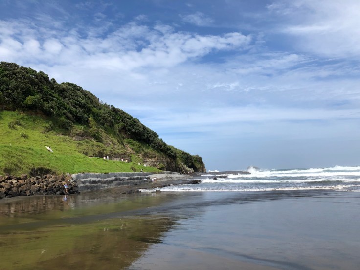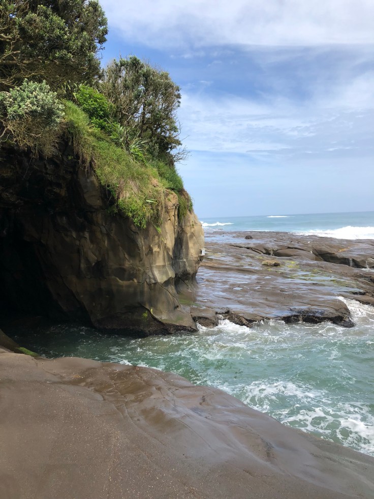 An hour later I arrived at Muriwai Beach. It was pretty. A nice little black sand beach. But also busy being only 45 minutes from Auckland. The sand was incredibly soft and again my feet loved the cool salt water. I walked along a little narrow rock shelf to see a little cave and watch the surfers, it was prime surfing conditions, being careful to stay towards the shore as I hadn’t changed into my bikini and wasn’t planning on getting wet above the knees. I was cognizant today that I would be going straight to the airport and wanted to stay relatively cleanish. I soaked my feet and looked around and realized the tide was moving in. Hmm, perhaps I should head back. My time was on a tight budget anyways. I started back along the narrow ridge when splash! Big waves started crashing against it, soaking me pretty much to my waist. Well played mother nature, well played. I got back to my car and once again stripped down and changed in the back seat this time putting on bikini bottoms and board shorts since the next couple spots also involved water!
