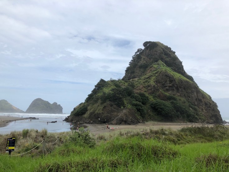 About an hour later I arrived at Lion Rock at Piha. Lion Rock is a giant rock popping out of the beach with climb that’s supposed to offer impressive views. The weather was gloomy, the beach was crowded. I parked and hopped out of the car to snap a couple pictures. I could see the steep stairs and grades of the hike up the walk. Do I do it? It was hot, humid, my body just barely starting to forgive me for the Tongariro. I stared for a couple minutes, got back in the car, and bid adieu. Maybe if I’d had a chance to shower before the airport I would have but nah.
