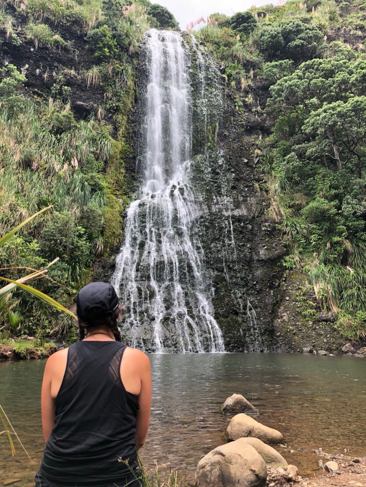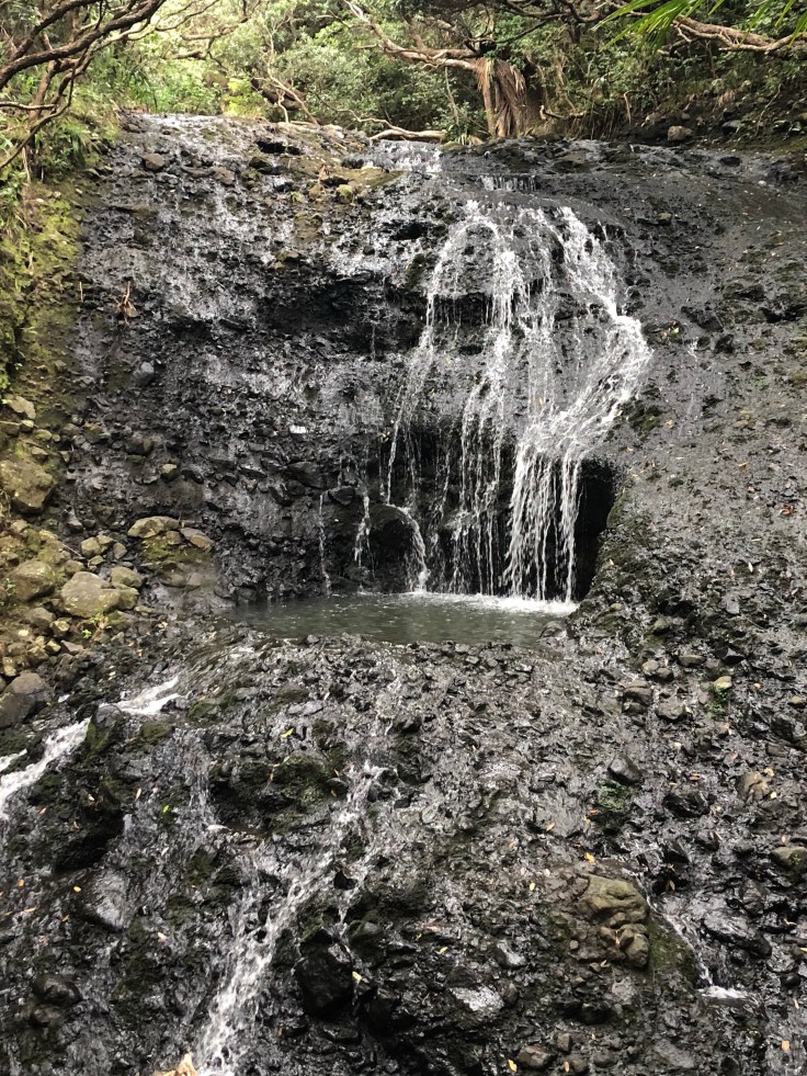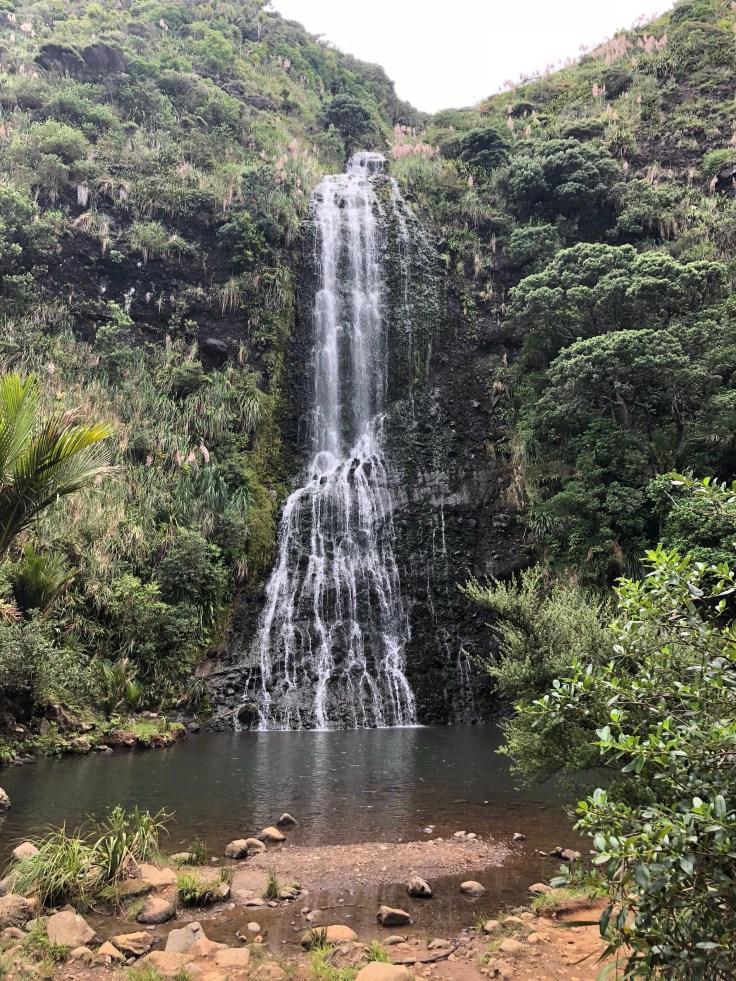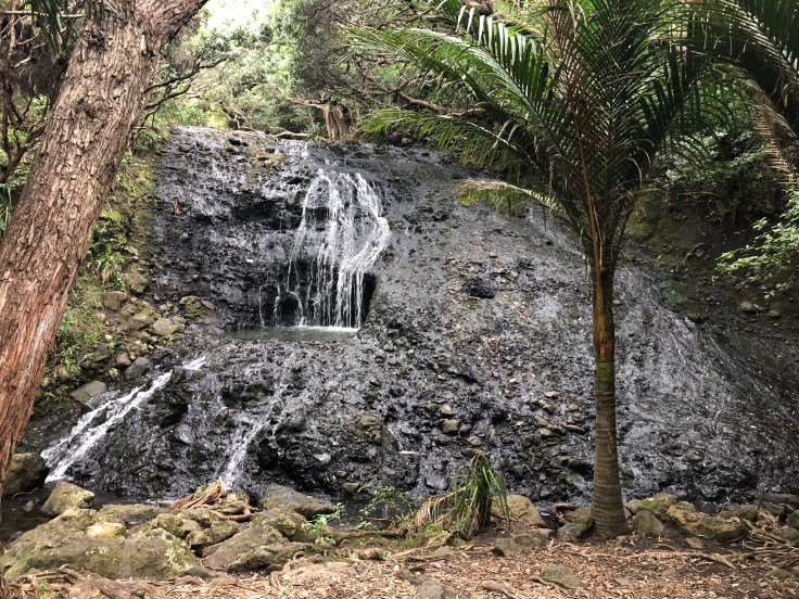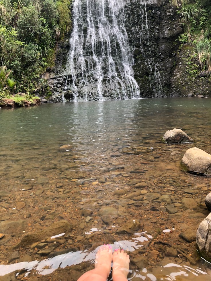The falls were lovely, there were few other people around but not many. I sat on a dry rock and put my feet in the pool, washing off the black sand that was still hanging on from Muriwai. Again, my feet were grateful for the cool water. As I had with Marokopa Falls, I sat and traced the paths of water down the falls. Just the same, the falls suddenly became clearer. Every time I started this trace I would notice new crevices and outcrops that I hadn’t before. This would be my last site to see before I headed back to Auckland. As I sat there following the paths down the falls my eyes welled with tears. I had no idea why and I quickly brushed them away. Sad to go I peeled myself and headed back to the car. There was another smaller falls along the way with an inviting little basin, the size of a backyard hot tub. I wished I had time to take a dip but that will have to be saved for next time.