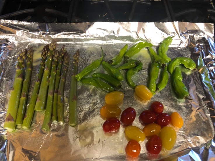 The vegetables I turn to the most include asparagus, tomatoes, okra, Brussels sprouts, shishito peppers, and broccolini. I pretty much prep them all the same way; arrange on a foil-lined baking sheet, spray with olive oil, and sprinkle with garlic salt or seasoned salt. Sometimes I also squirt with lemon if I happen to have one cut. I love cooking these veggies together since, for the most part, they have the same roasting times. Roughly 13 minutes at 350*, 12 minutes at 400*, or 10 minutes at 425*. Just set it and forget it. The only outlier are the Brussels sprouts which I halve and actually toss with olive oil and seasoning instead of just spraying and they get 30 minutes at 400*.