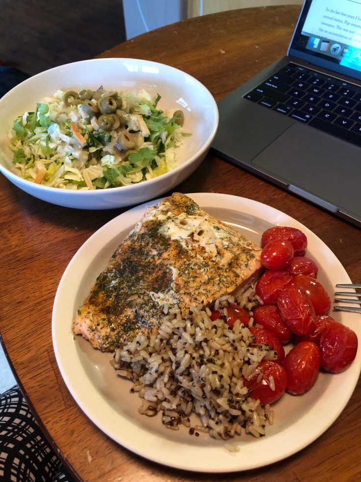 Salmon. I eat A LOT of salmon. It’s healthy and delicious. I buy packs of individually wrapped frozen Atlantic salmon from Whole Foods. They take about half an hour to thaw in warm water and are my go to. After thawing I put them in a glass dish (on parchment paper for easy clean-up) and top with a spray of olive oil, fresh lemon juice (if I have any), old bay seasoning, garlic salt, lemon pepper, and dried dill. Then in the oven for 14 minutes at 425* and perfection. Often I serve with roasted asparagus and tomatoes, delicata squash, or riced cauliflower sautéed with edamame and/or green beans. Once the salmon is thawed the entire prep for this meal takes under 5 minutes.