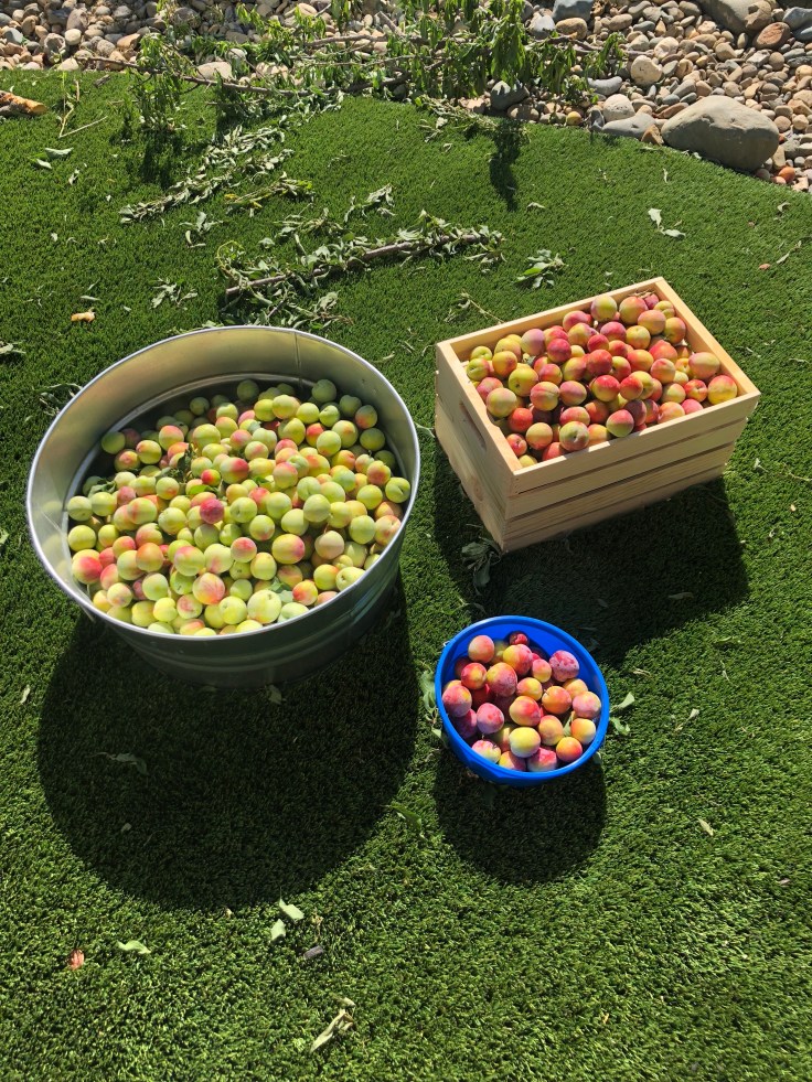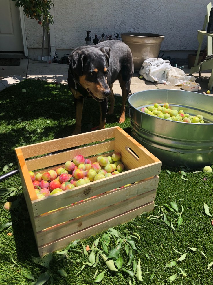 Lizzy and Zeus were both quite helpful. Zeus would come grab branches and run off with them. Lizzy would go back and forth between the two fruit containers picking out plums to toss around and play with. Both kept me company, for about the first hour. As I started picking, plucking, and clipping I was not surprised that the tree had snapped. I’m sure Zeus’ tug-o-war games didn’t help but the branches were SO heavy with fruit it was a bit shocking.