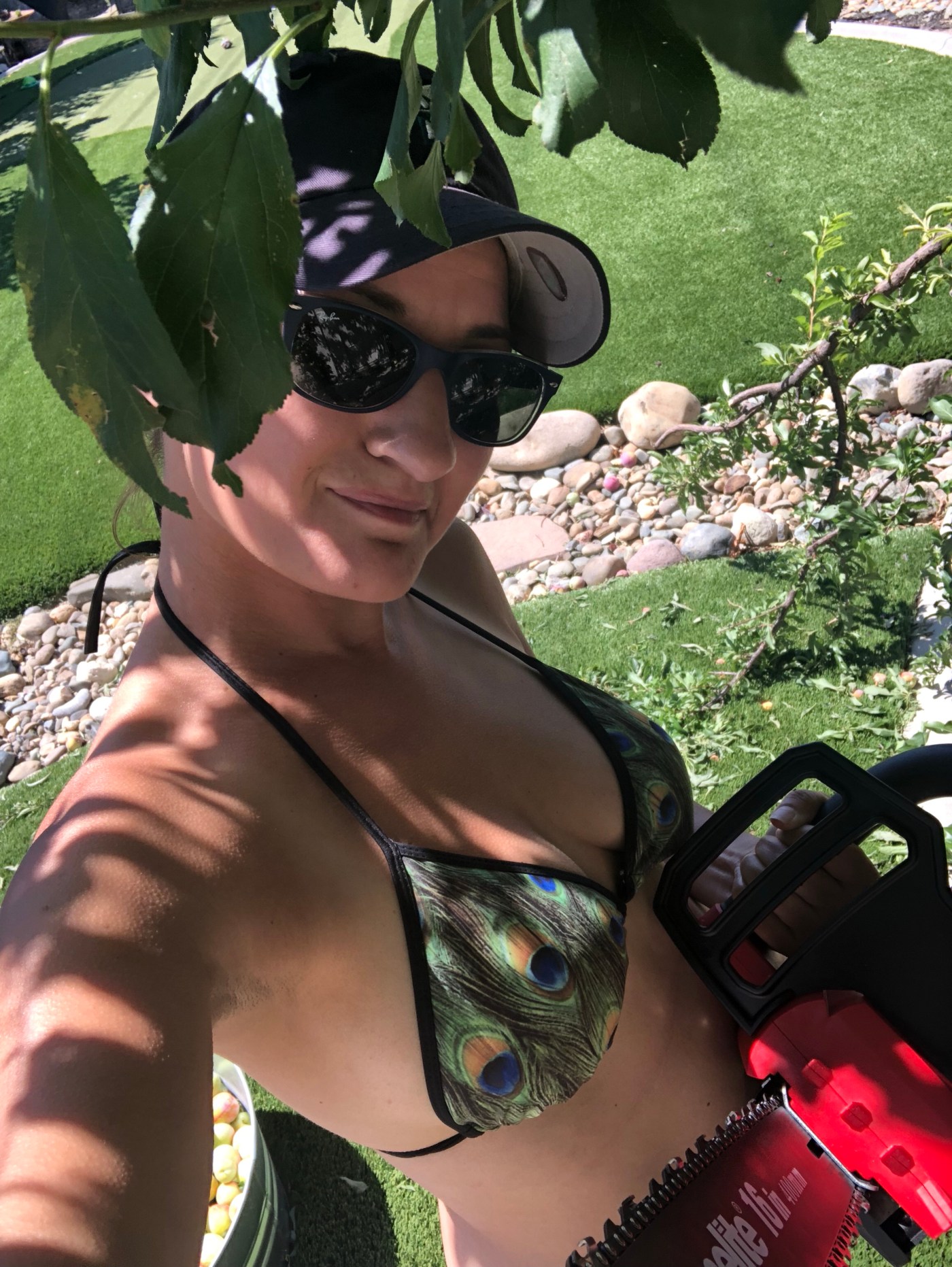 After a couple more hours of plucking and trimming off the smaller branches it was about time for the chain saws. I have never used a chain saw before. I considered the fact that I was in a bikini and flip flops and thought maybe I should change. But 4 hours of manual labor, and 5 hours into this project now, I just wanted to keep going. So I sat down, opened my new toys, unwrapped the users manuals, looked at the tools, and decided I could figure it out! I set the manuals aside, made sure the dogs were safely behind the gate on the other side of the yard, and went to town. I mean, doesn’t every woman wield a chain saw in a bikini?! I started with the regular one. It took me a second to figure out how to actually make it go (apparently these things have safety locks) and then I went for it. I was surprised at how many wood chips and shavings went flying but I had sunglasses on so I was good! I continued to get pummeled on the head by more falling fruit while chain sawing away. I’m not too shabby with a chain saw!