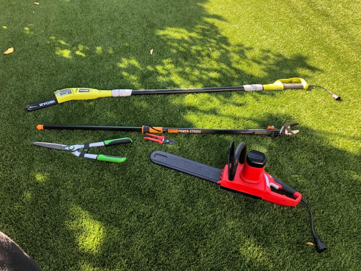 Mr. Home Depot went to grab his lift to look on top for the chain saw. While he was looking, my eyes wandered around the aisle and I spotted another cool chain saw gadget, a short 8” saw on a 9’ telescoping pole! YES! This would come in handy! Not just with this tree but I have a variety of citrus trees I struggle to trim back every year, this seemed like the perfect answer and wasn’t too pricey so I loaded it into the cart. After another good chunk of time waiting, Mr. Home Depot finally went and checked receiving and then came back defeated that the 7 chain saws were nowhere to be found. He came back just in the knick of time as I was about to add a power washer to my cart too… Since they couldn’t be found, he offered to discount the next model up to only $5 more than the little one I wanted. While I really wanted something that felt smaller and more manageable, this deal was too good to pass up. Zeus and I checked out and headed back home to dive into our project.