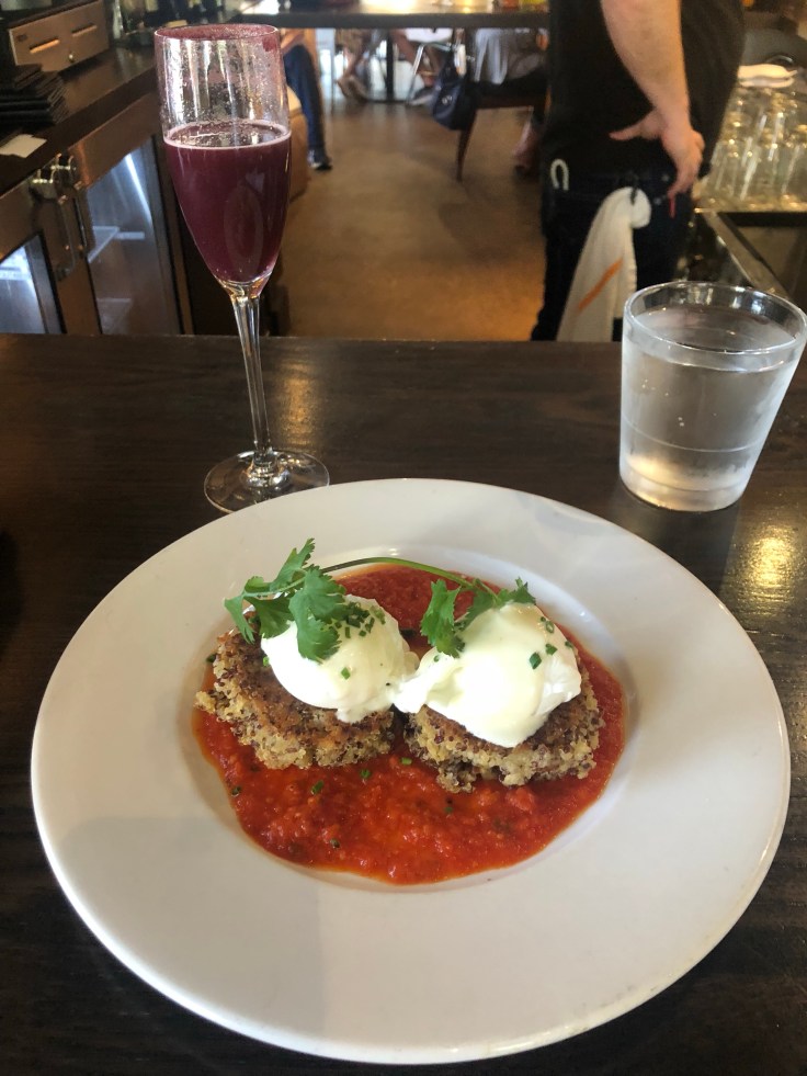 Saturday night was a loss, I got in late in the evening and was tired from flying all day. All I wanted to do was hop on a treadmill and get some sleep. But Sunday morning I was ready to see what this city had to offer. The first order of business Sunday was to find a place to get some brunch. Yelp was down so I settled on the power of the google and landed on Beatrix, a spot that promised delicious food with a healthy flair. Perfect. And walking distance. I was in awe of the beautiful architecture as I walked the streets of downtown Chicago. And then I was in awe of the line of people outside Beatrix as I approached. Hmm. I walked in and overheard that wait times were an hour or more. Hmm. But they had a bar. Jackpot, benefit of traveling alone is a single seat at the bar meant no wait for me! I slid right in and got started with a blue mimosa. What is that you ask? A blueberry mimosa. Try it. So good. My poached eggs over quinoa cakes with a delicious basil tomato sauce was heavenly.
