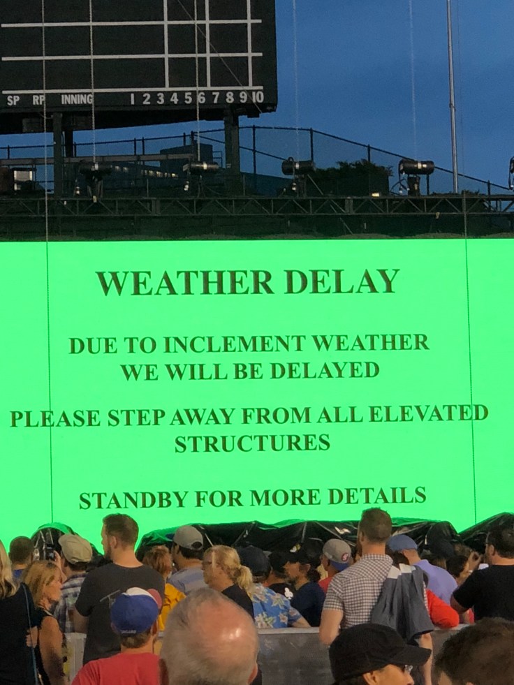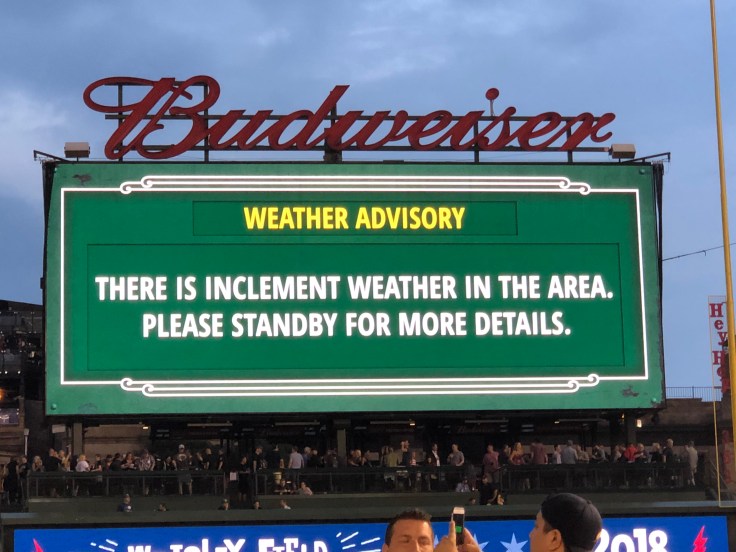 As 7:30 came around and the show was supposed to start a dude took the mic and announced that a thunder and lightning storm was eminent and that folks on the pit and field had to evacuate the field area and take shelter. Awesome. Everyone filled into the narrow halls of Wrigley crammed in like a can of sardines. My new friends sent me a text that they were in a field level bar and come meet them. I had gone past that bar and security was not letting anyone else in. But wait, my new friends told me, there was a small side door left unguarded, I could sneak in. I thank my brother for all the pit lessons he’s given me in life and the pits we’ve worked our way to the front of together. Those skills helped me greatly as I pushed my way through bodies crammed so close together you couldn’t see light through and made it to the unguarded side door. I was in! I found my friends and we spent another 90 minutes watching the rain crazily pouring down. And realizing that dudes were actually peeing in the corner of the room! Gross!