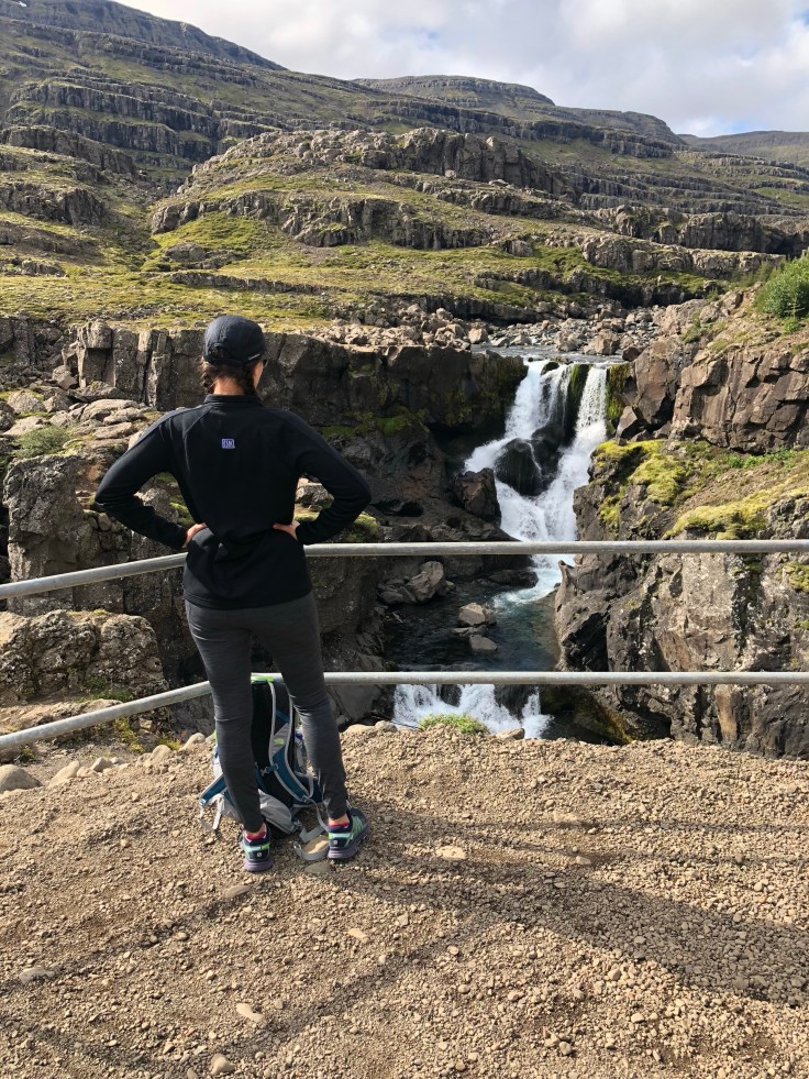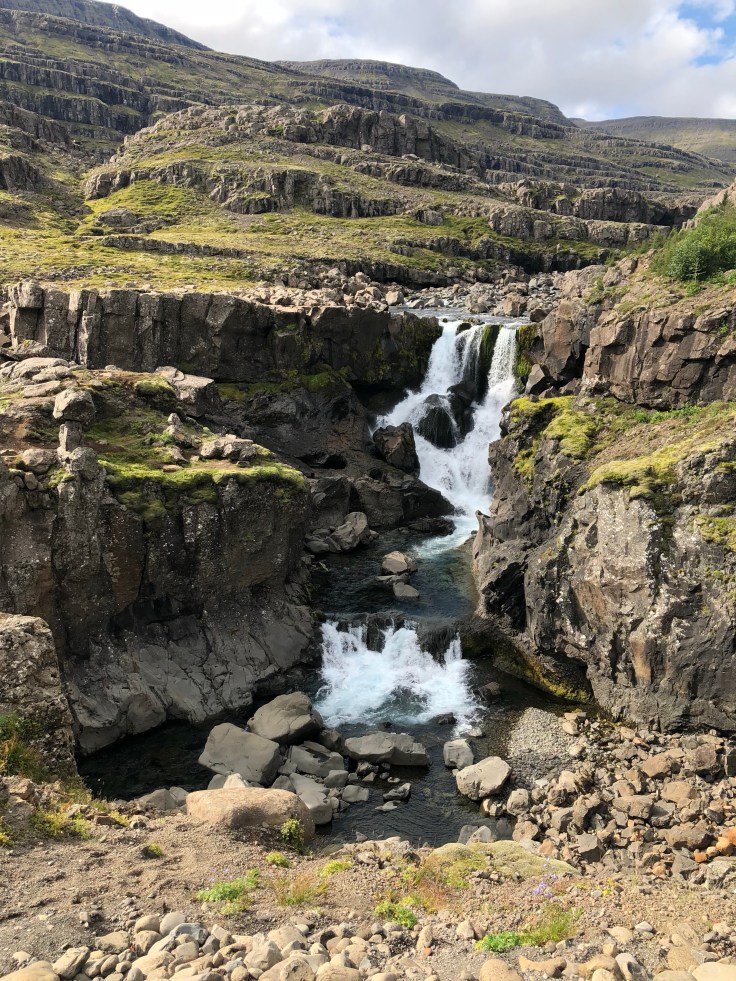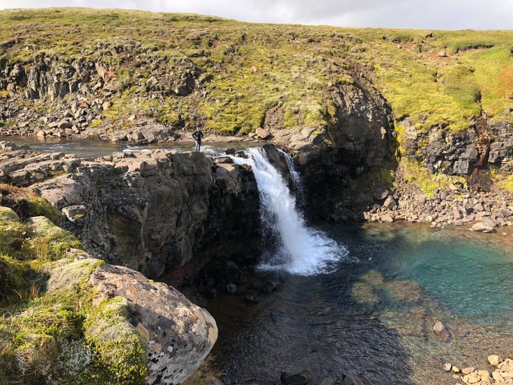 Heading towards my next stop I turned down a side highway and off of the Ring Road and the coast, heading inland for a bit. I had close to a 2-hour drive ahead of me. The road taking me inland was beautiful and had a rushing river flowing alongside it. When I got the opportunity I pulled over and scrambled over some rocks down to the bank for a closer look. This was also my first time filling a bottle with pure, fresh Icelandic water. Everything I read and everyone I talked to said to do it. And it was wonderful. I love water and am a bit of a water snob and this was the purest, most perfect, water I had ever tasted. I walked a bit and found myself at the top of a waterfall! With no other people around and what could be a great photo I was again glad I had my little iPhone holding tripod and remote in my pack! I staged my shot and headed back over to sit at the top of the waterfall with my feet dangling over. And then I decided that was a super stupid and dangerous idea and stood a couple feet away instead. At least I had a cool idea originally!