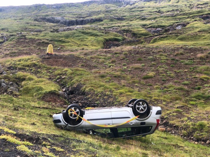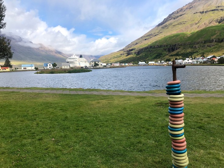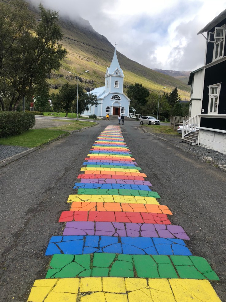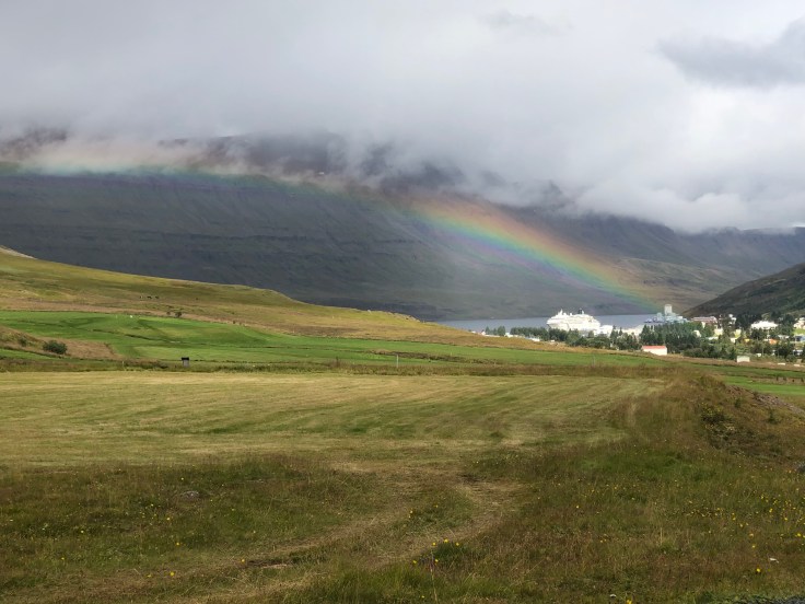 I admired the ever-changing landscape and good windshield wipers as I made my way down a fjord into the little town of Seydisfjordur. This town took me about an hour out of my way roundtrip but I’m glad I went and wish I could have spent more time there. The town offered me some interesting scenes; a car overturned on the side of the road (hope they too had all the insurance!), a beautiful golf course (sadly it was closed or I just may have gotten in 9 holes), a large cruise ship in the small bay, a beautiful little church with a rainbow road leading to it, and some fabulous little artisan shops. I admired the sights, bought a pair of earrings made out of sheep horn, had some lunch, and hit the road. As I made my way back up the road I decided to pull off for a good shot of the golf course and was met with a gorgeous scene of the course and town with a rainbow arching above it.