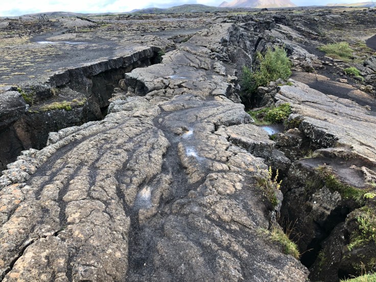 From the geothermal area I headed to the Grjotagja Cave – some cave with a hidden warm pool that supposedly some famous Icelandic outlaw hid in. The cave itself was not very entertaining but I spotted a little trail up on top of and behind the cave and that made the stop worth it. I climbed up and found myself standing above the cave and atop a fissure in the earth with the cave beneath. Standing on the earth and contemplating how it just split open was a mind fuck. Off in the distance a bit I could see a giant black crater. It was intriguing to me. I wanted to know more about this crater. I scrambled back down and headed off to the Lofthellier Lava Cave.