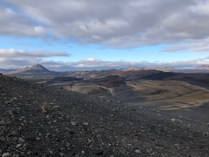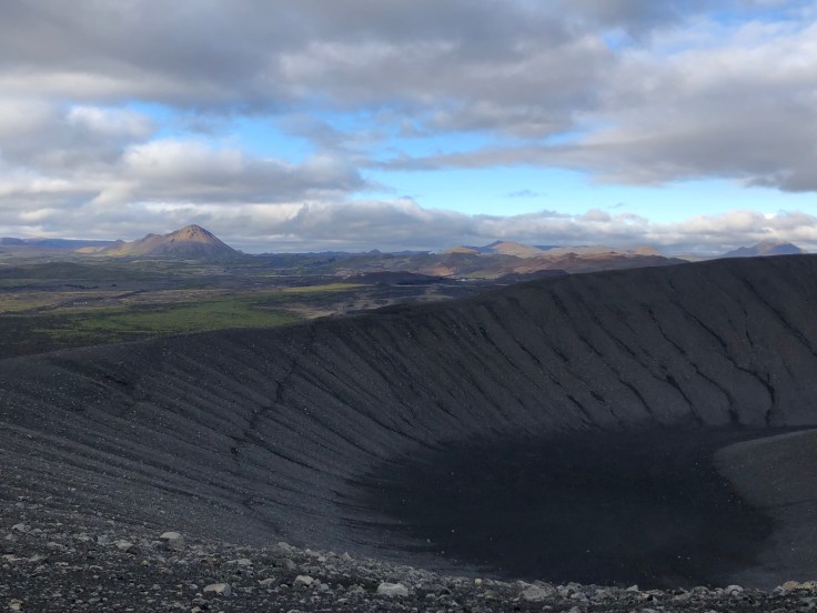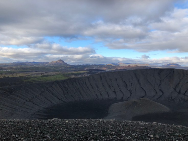 Well, I never found the Lofthellir Lava Cave but I did find myself at the base of this dark crater that was calling to me. I had stopped on the road for a better view of it and realized that I thought I could make out little specks on it, people were climbing it. I immediately honed in. This was the Hverfjall Crater, and it was about to be another volcano I climbed. It was a steep climb up the slope. Sorry calves! And it definitely warmed me up! As I made my way to the top I found myself staring into another beautiful volcanic crater. This one all black and ashy, unlike others I had seen before. And when I finally moved my gaze from the crater and looked around me I was stunned, from this viewpoint the surrounding landscape was stunning. I’m pretty sure this was the most mesmerizing landscape I had seen on this trip. I was totally in the moment. There were some elevation changes along the way but it was a no-brainer for me to hike around the entire rim of the crater. As I started up the elevated lip the winds picked up and I was frozen once again. I stopped and put all the layers I had peeled off back on and continued. I was in awe, I kept stopping just to look around and soak it in. I wanted to talk to my sister on FaceTime so bad so I could show my older nephew the beautiful volcano. Last time I visited, Matteo and I played the hot lave game and he would have been even more mesmerized than I was. About halfway around the crater I realized that there were very few people up on the trail at that moment and nobody near me. I took my time letting my eyes absorb all the magic around me and letting my ears absorb the silence. Aside from being IN the other volcano my first day, this was the pinnacle moment of my trip so far. I found myself grinning. Just standing there, spinning around to see it all, and grinning from ear to ear. Everything about this little 3ish mile trek was perfect and I made what will for sure be an everlasting memory. I didn’t want to leave her.