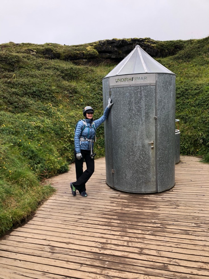 I drove out of the lava field, continuing on to Kirkjufell Falls. As I approached the falls I could see them right off the road. They were little and surrounded by a ton of people. I quickly decided I was not interested and kept driving to the western most tip of the peninsula and the Vatnshellir Cave – a lava cave beneath the Snaefellsjokul glacier. Well actually, a lava tube that has crashed in and opened as a cave, originating from the Snaefellsjokul Volcano. The Snaefellsjokul Volcano is that which they descended into the crater of in the tale “Journey to the Center of the Earth” and is predicted to erupt again in next 200-300 years. In volcano time, 200 years is not much and could be a rounding error so that definitely set in my mind, but nonetheless I descended down a special spiral staircase and 35 meters below the surface. You entered the staircase on land via a special little chamber that looks like a porta-potty.