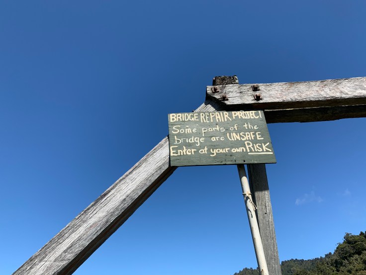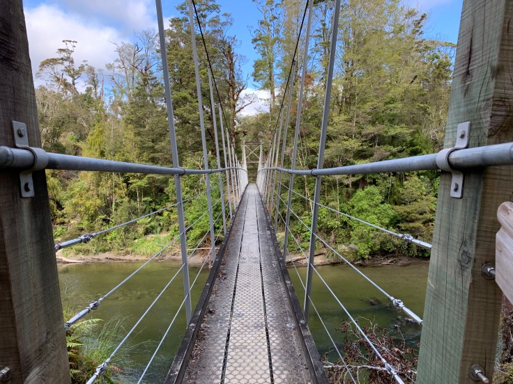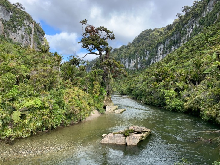 Now it was time to do some real hiking. I found the trailhead for the Pororari River Track and off I went. The Paparoa National Park has a very impressive trail system and this particular section winds along the beautiful Pororari River. It would be a down and back hike since I wasn’t sure how I could get back to my car from the other end of the trail but that was fine by me. From the moment I stepped onto the trail I was in awe of the lush forest surrounding me and the beautiful stone formations overhead. The trail itself had beautiful views and was interesting without being overly challenging. At one point there is actually a little tiny cave that the trail takes you through. Coming out the other side of the cave I momentarily forgot about my terrible depth perception and almost ate it trying to get down some stone steps. Oops. I made it to the end of the trail and decided to go a little further onto the connecting Inland Park Track to find the swingbridge I had seen on the trail map. Plus I was doing pretty good on time. I found the swingbridge and it definitely swung when I walked across it! A little gust of wind didn’t help either! I decided to go a little further into the Inland track but after a few minutes realized it wasn’t nearly as pretty as the river track and I did have over an hour hike to get back. I considered my timing and decided to turn back. At this point I wouldn’t get back to my car until close to 7pm and I still had another 40 minutes or so get to my AirBnB for the night.