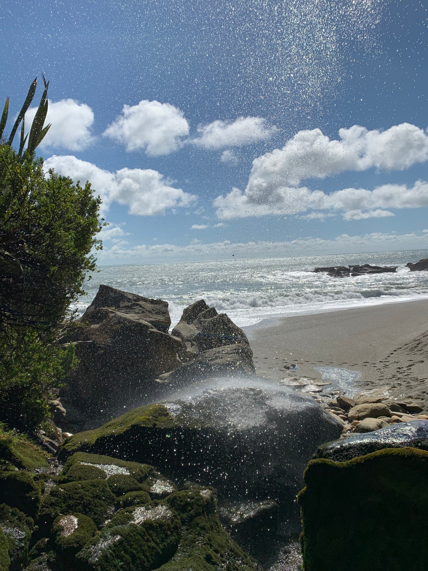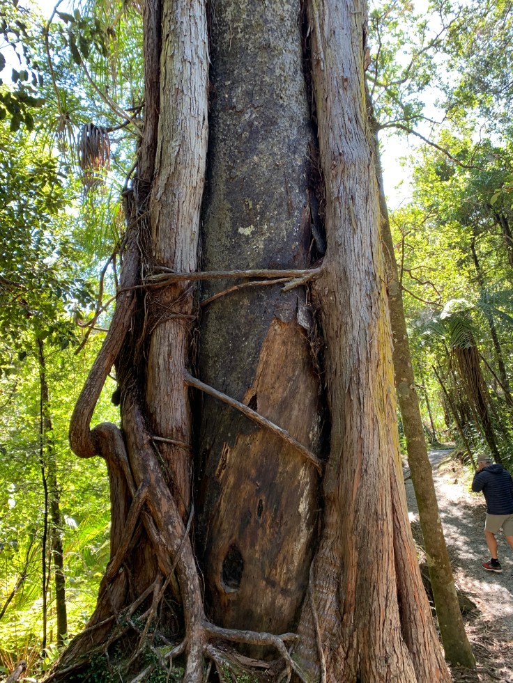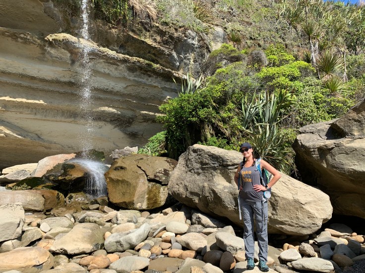 From there I made my way to the Truman Track. A short path from the highway down to the water’s edge through the lush forest. I saw some fascinating tree formations where the trunks looked like they were being consumed by other trees. This little track was decently congested and the lack of trail etiquette was frustrating. When the trail popped out onto the coast it was gorgeous. The cool misty breeze spraying light saltwater across my skin felt divine. A sign let me know that penguins nest here but still none were to be seen. Apparently they only come ashore around dusk and dawn to feed their babies. I’ll have to google if there are supposed to be any on the beaches near me tonight and maybe an early morning trek is in store for me. There was a little waterfall on the cliff against the beach and I climbed all the way down the trail and dodged waves across the beach to reach it. This beach was more pebbles than sand and my feet sank into the wet gravelly ground – which was perfect because it cleaned all the muck from the shipwreck yesterday off of them! The little inlet was beautiful. I was alone down there save for two other people. I exchanged picture taking with the couple and watched the waves crashing before heading off to my next destination.
