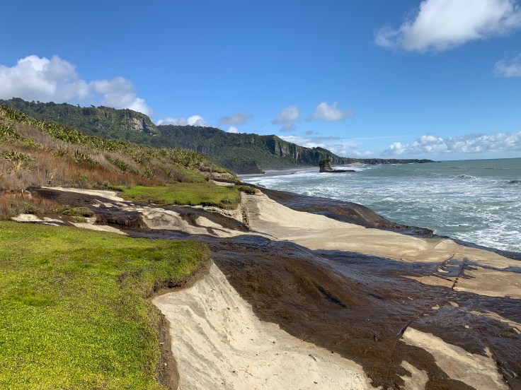 As the highway turned along the coastline I saw sign for the Cape Foulwind lighthouse. This would not have even been on my radar but I remembered my friend Kyra suggesting the lighthouse’s accompanying trail from her adventure here earlier this year. I veered off the main highway and followed the little side road. There were two options for picking up the trail. Either at the lighthouse itself and then you follow it down to the seal colony and back. Or vice versa. I decided to start at the seal colony. Cape Foulwind was gorgeous but aptly named, I had to fight at times to keep my beloved hat on my head. The trail was an easy one. The seal colony was not much of a colony though. The seals camouflage really well with the rocky terrain. Unimpressed I tracked on. In the end I stopped short of making it all the way to the actual lighthouse. As I was getting closer to it I didn’t feel an overwhelming need to inspect it firsthand and I was very conscious of the time as it was already past 2pm and I had a number of other sites I wanted to try to find today.