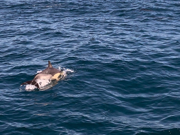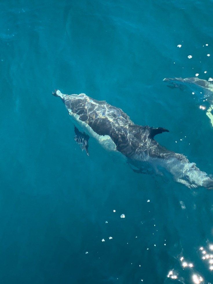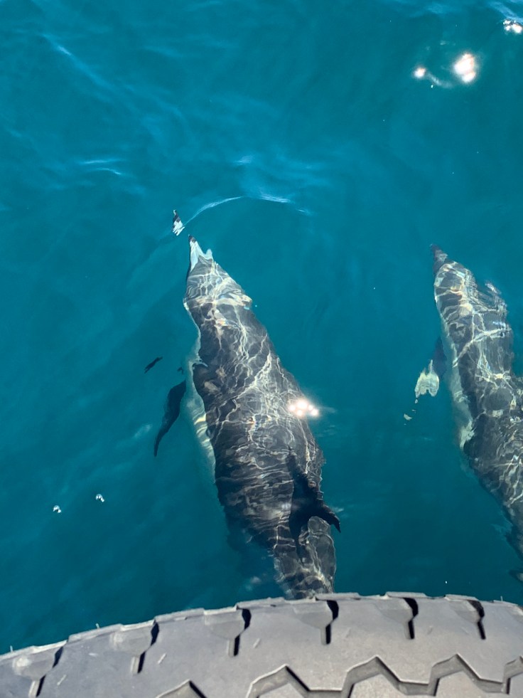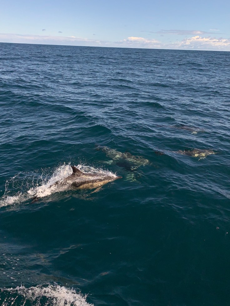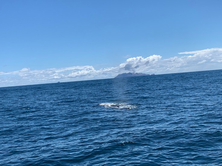 And then the boat slowed, one of the crew had spotted a dolphin so we should have a look. I looked out and there was a sea of birds in the distance, that was definitely a sign marine mammals were present. The sea was still rough but the boat was slowing, we could move about if we went, slowly and carefully. I made my way out to the deck and sure enough eventually I spotted a dolphin. As we approached the sea of birds I realized I wasn’t just seeing waves now, I was seeing more and more dolphins. The Skipper came on the loudspeaker, “Well folks, we’ve found ourselves a feeding frenzy. I’d estimate there are about 500 dolphins in this pod.” And sure enough, we were surrounded, dolphins were everywhere! Playful, curious, and friendly they flirted alongside the boat. I’ve never seen so many dolphins in my life. After a while it was time to get a move on. The seas had calmed a bit so the crew said people could stay out on deck as long as they held on at all times. It was bright and sunny and I decided to stay out and take in the sea air. I realized that riding the waves was a lot like riding a horse, you just have to rock your body with the motion to keep your balance. White Island was starting to appear in the distance. I was feeling amazing. For a moment, I had no care in the world as I leaned into the motion of the waves and felt the gentle spray of the sea. I realized that no matter how great I was feeling, I was still clenching my jaw and physically holding tension. I made myself unclench my molars and put the tip of my tongue between my front teeth to make sure I didn’t allow myself to tense back up.