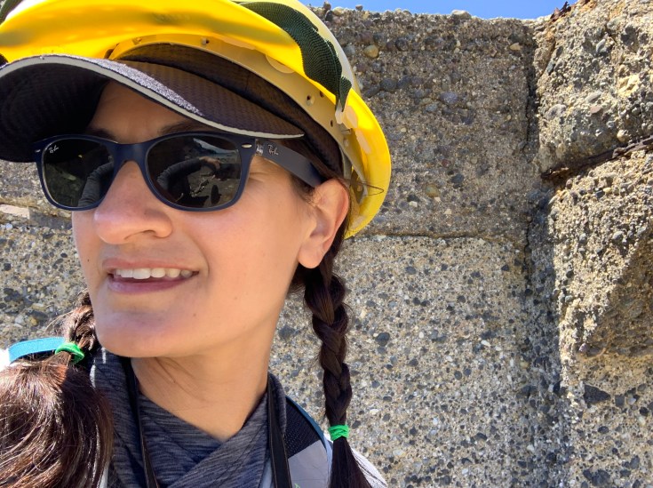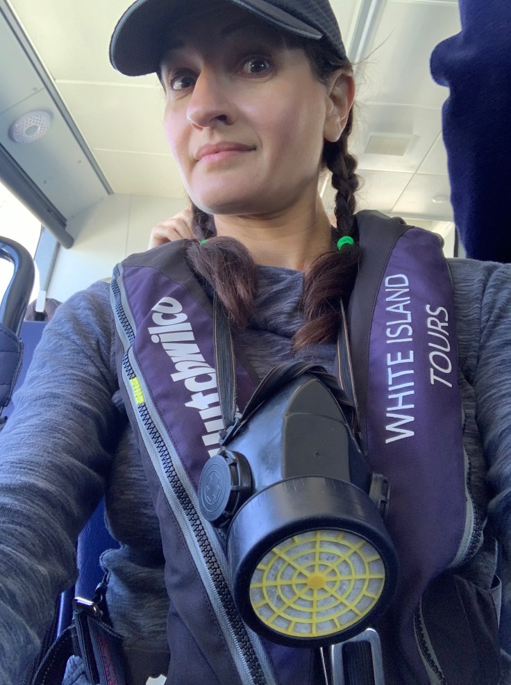 We’d wasted a lot of unplanned time stopped with our marine friends, it was time to get to the island. Everyone was asked to return back in the cabin, as the boat picked up speed again, to be fitted with our gear. Yes, gear. An inflatable life vest since we’d have to transfer from the boat to a little inflatable dingy to get to the island, a hard hat to be worn at all times on the island, and a gas mask. I must say, this is the first time I’ve ever been on a tour where I was supplied with a gas mask to be kept around my neck at all times.
