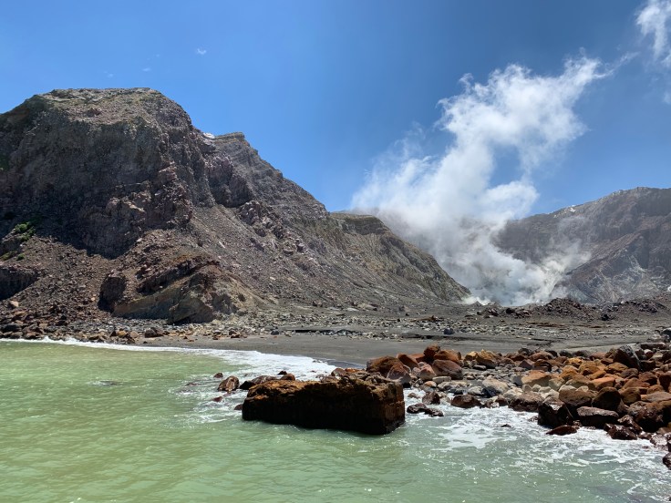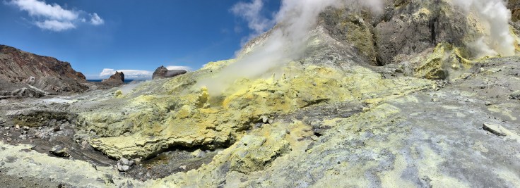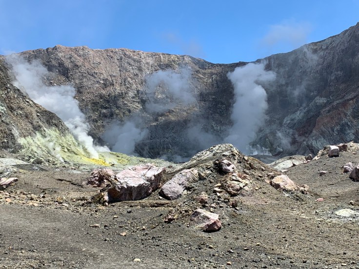 We were able to ditch our life jackets and first up a brief, very brief, safety briefing. Hard hats to stay on at all times. Gas masks don’t have to be used but might want to if the sulfur steam gusts towards us. Oh, and in the event of an eruption put the gas mask on. I felt like saying that in the event of an eruption I’m not sure how long the gas mask would be relevant! Though we’d stand a chance, Moutohora (the actual Maori name of the volcano) doesn’t erupt like crazy spewing lava like everyone pictures with any volcano eruption. Her eruptions include spitting out ash and lava bombs that range from golf ball to compact car size that come flying out as hot lava but the outer layer cools into rocks before shattering upon landing. Moutohora has a very high silica content, about 60-70%, which makes her lava bombs so fragile. This crater is pretty young, having only been created with a major eruption in 1976.