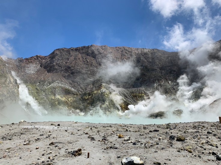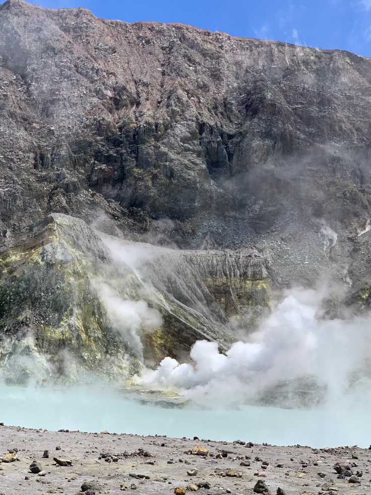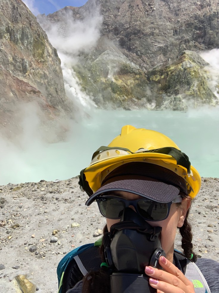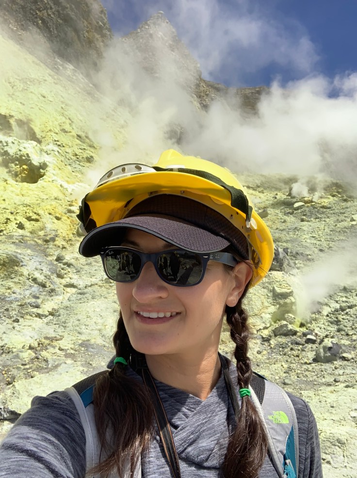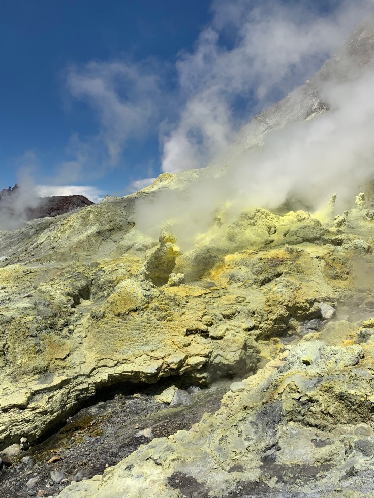 So what is White Island you may be wondering? Well, it is an active volcano. It is New Zealand’s only active marine volcano, sitting a little less than half out of the water, and the most accessible active marine volcano in the world. White Island is the volcanic crater itself. It is actually a little controversial just how safe it is to visit the island. She has erupted without warning before and has erupted as recently as 2000, 2010, and 2016! This tour group is the only one that has permission from the government to even dock there and certainly the only one with permission to take people there. When you visit White Island you are literally walking INSIDE the crater of an active volcano. In contrast to when I did the Tongariro Crossing and even though I was between two active volcanoes and standing on the lip of the crater, the crater itself was inaccessible.