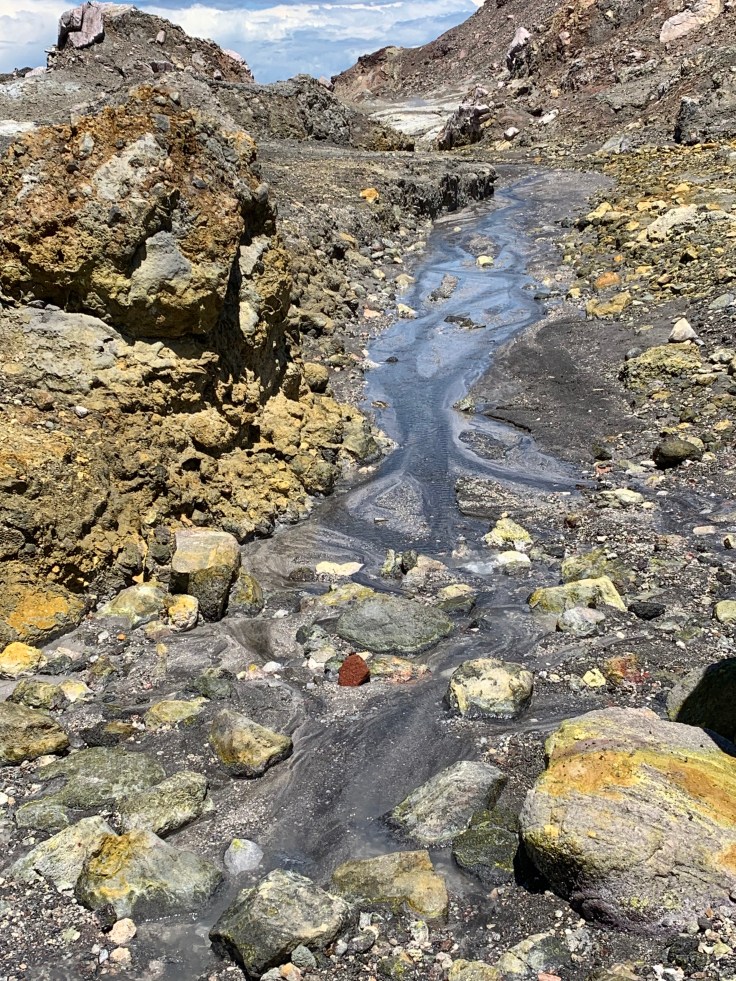 The crater lake also bellowed sulfur steam at the group and made it really hard to admire for too long. The lake comes and goes in the deepest part of the crater as the weather patterns change. It’s only in about the last 11 months that it has filled with water again. Fun fact, the water in the crater lake is about 60x more acidic than car battery acid.