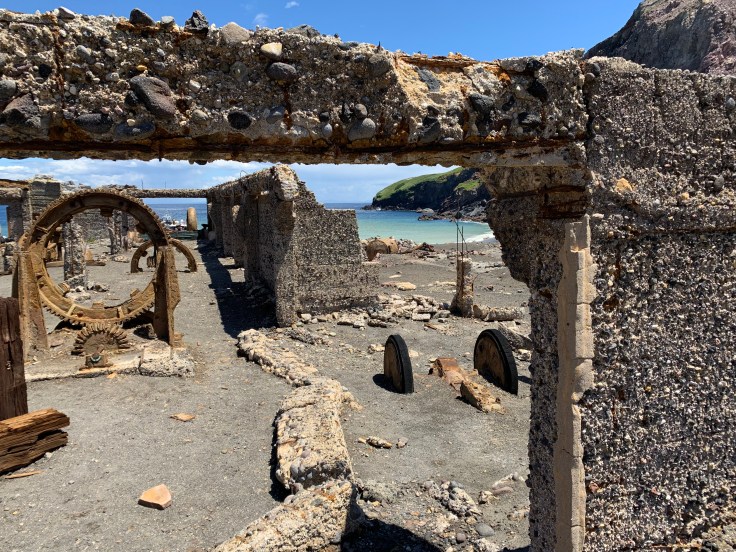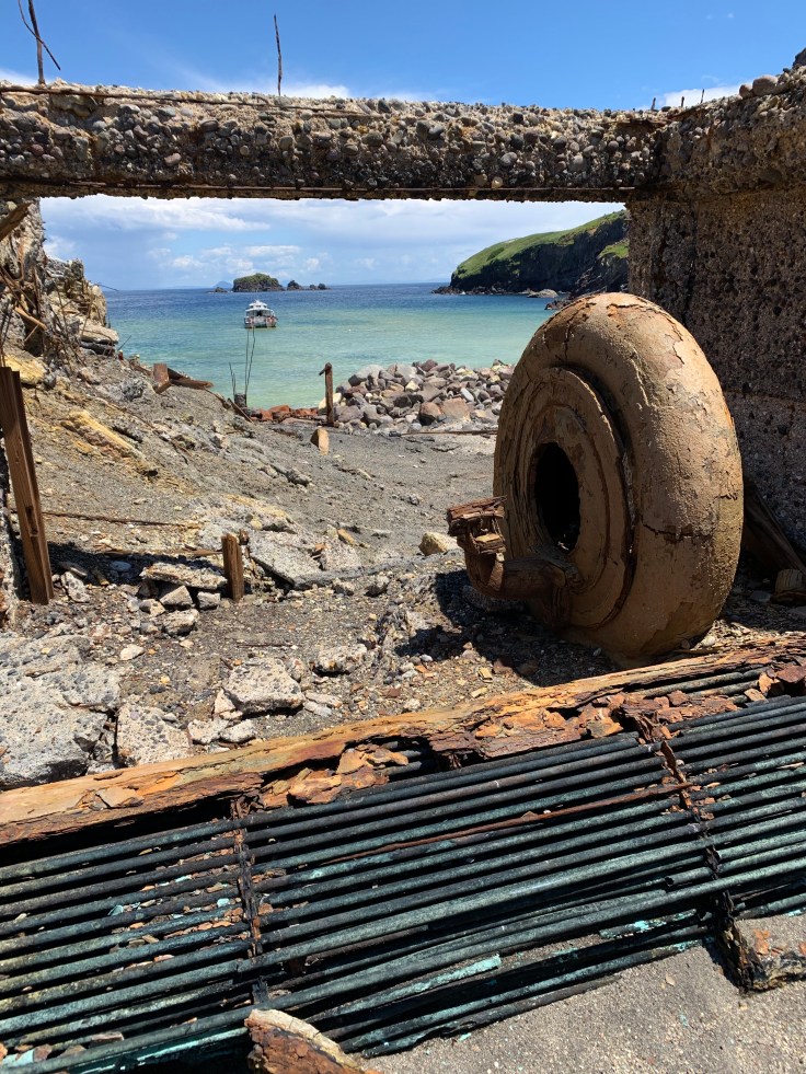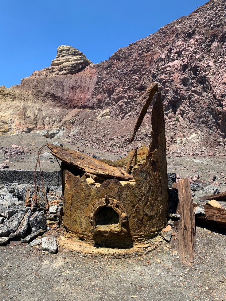 Once upon a time they actually used to try to mine sulfur from the volcano. In the early 1900s those mining operations were all shut down after crew kept dying from eruptions and landslides. The old mining factory remains in the crater. The remaining equipment is beautiful and eerie. Walking through the old sulfur mining operations, what brittle pieces were left of it, felt like going back in time. It was kind of creepy, I felt like I could feel the souls that had died here. Despite the eruptions that have occurred somewhat regularly, some equipment and pieces have withstood. The effects of the eruptions, sulfur, and sea water were gorgeous. But all the metal was crazy brittle, Amy said it was so brittle most of it could probably be broken by hand. As I walked around a corner I encountered a kid, late teens maybe, stomping a piece of the metal relics trying to see if he could break it. I couldn’t help myself. I walked right up to him, “Dude, really? Don’t destroy it for everybody, have some respect.” I hoped he’d fall overboard on the boat ride back.