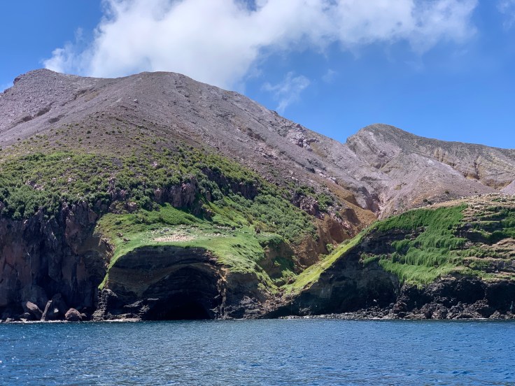 And then it got better. Looking ahead I thought I saw a spout. I strained my eyes and the next thing I knew one of the crew was beside me, they’d seen it too. We’d spotted a whale! Apparently this is a rarity out here. Amy, the crew guide beside me, is on her fourth summer working with this group and this was her first whale sighting during a tour. The boat stopped and, again with warnings to hold on at all times as we were still rocking a bit, everyone was encouraged to come see it. What kind was it? The last whales they saw out here had been humpbacks. This was not a humpback, I could tell by his proportions and fins. He swam around the boat just below the surface and occasionally came up to say hi. He was finally identified as a Fin Whale, the second largest whale species on earth. That made sense, he was super long and very narrow. Simply stunning. Nothing like a little whale watching with an active volcano, that you’re about to walk into, venting steam in the background.