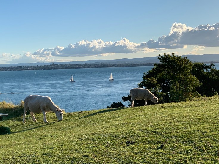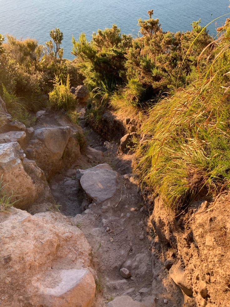 The trail led through a sheep pasture as it wound around the mountain. I stopped and laughed at the view before me, of sheep and lambs grazing with sail boats in the background. Where else do you get to see that?! The trail was steep but had amazing viewing points. Of course I was glad I made myself find parking and get out there. At one vista it looked like the wide track just ended abruptly. That was weird, I thought I had seen the trail turn but when I looked back I didn’t see it. Then I noticed a cut in the brush, aha, the trail narrowed and continued up. Off I went. This part of the trail was narrow, steep, and rocky. It went from completely groomed and about 10 feet wide to 2 feet wide or less and all terrain. I had just been thinking about how little my bad depth perception affected me this trip when, holy crap, now the trail was really narrow and there was a steep drop off the side, ugh. I did not love it. I hugged the walled side and slowly crawled my way up. My knees were reminding me that in my haste this morning I forgot to take my turmeric supplements. And my right hip, it decided to strongly remind me that it was still pissed from whatever I did to hurt it during my Queenstown hike a few days ago. I need to get better at distributing my weight better I think, I may be putting too much pressure on my right side.