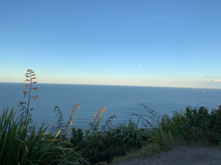 At the top of the mountain I was indeed rewarded with stunning views of the nature behind me, the sea in front of me, and the town beside me. I noticed the moon was already up and noted it as the last moonrise over New Zealand I would see for this trip. The sun was beginning to set and the sky turned pink over the ocean as the skies to the west turned orange, while the sun slowly retreated behind the clouds and the hills. I knew there was another path up the mountain, one that involved stairs, I would find that path to take down. The trail markings were still super unclear but I figured with enough trial and error I would figure it out. I had seen one wide path on the back side of the hill near where I came up and figured I’d try that first to see if the direction seemed right. And son of a bitch, that wide manicured path took me to that vista from earlier where I didn’t see it and started up that steep mountainside trail. Yah, didn’t have to do that. Just had to walk about three more feet and I would have seen this continue on. I’m pretty sure that trail will be my last hike of this trip. My hip is really mad at me and I don’t want to do anything too strenuous tomorrow.