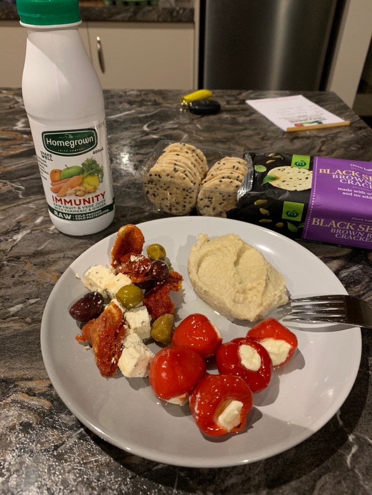 On my way back from the hike I stopped at the local Countdown to pick up something for dinner. I decided to make myself a nice little meditaranean spread of hummus, cheese stuffed baby bell peppers, feta, olives, sun dried tomatoes, and crackers. With a fresh juice for greens. The produce aisle at the Countdown reminded me that I want to start eating more pumpkin. It’s so good Hangi style! Seems like the perfect veggie for some instant pot experimenting when I get home.