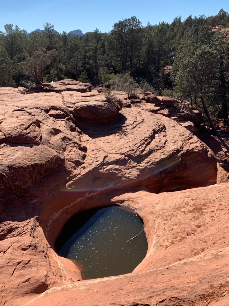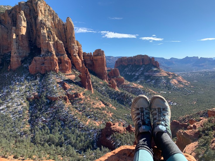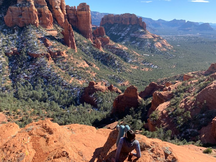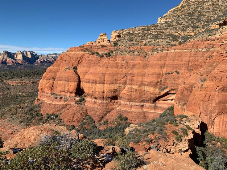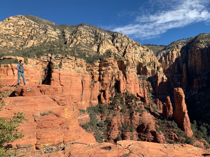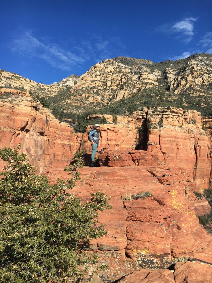 After a decent amount of time we came across a woman on the trail with her poodle. So many poodles in Sedona! This woman was geared out like she knew what she was doing. Our first realization she was coming our way was when we heard her holler to a couple who had gone off the trail to make sure they knew they were off the trail and people got lost out there all the time. She had a pack that put mine to shame complete with a large GPS navigator, whistle, and giant knife attached to the front straps. She wore a wide brimmed safari looking hat and carried trekking poles. I’d guess she was in her mid 60s. You could tell she was a badass. We shall call her Sue. We realized after speaking with her that we never got her name but she seemed like she could be a Sue. We asked Sue if we were on the right track to get to the caves and she scoffed, telling us that we had passed them but they weren’t worth our time. How the hell had we passed them? Jenny and I had a coy exchange trying to decide if we really wanted to go back and find the caves but Sue was adamant that it wasn’t worth our time. But, fear not, Sue had what was certain would be a better trek for us. She told us of an unmarked side hike out to a giant “mushroom” cap that would offer 360* views. “Are you both ok with edgy ledgy?” Sue wanted to know. I told her yes to an extent and she pointed to a ledge off in the distance and described the side trek out to a Mormon Canyon overlook. She instructed as to just stay to the left every time and eventually red rocks would come into view. We were hiking in the same direction now, she had been coming off a side trek when we met up with her. She told us to go on ahead and not let her slow us down.