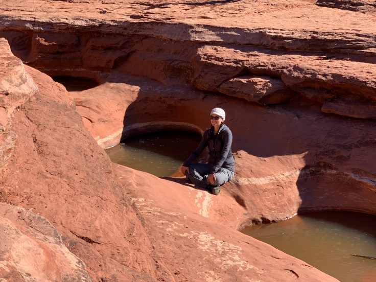 We made our back to the Brins trail and were so glad we had started on Soldiers Pass instead of Brins as the trail was quite steep and coming up it would have sucked. We were both getting hungry. We had picked up sandwiches for lunch, but they were in the car. I had snacked a couple times but was ready for real food. The Brins trail provided yet another trail atmosphere and was just as gorgeous as Soldiers Pass. The sun had moved and it was getting chillier again on parts of Brins. We wondered how much longer we had and kept going. Surely we had to be close. We spotted a parking lot and thought we had made it. Nope, this was a different trailhead. We checked the trail map again and realized that Brins didn’t actually loop back to Soldiers Pass. We had another mile to go taking the Cibola Pass trail to the Jordan trail before connecting back to Soldiers Pass. And Cibola Pass was steep. We whined about wanting flat land and food as we made our way along, often times pausing and surveying the land trying to figure out which way the trail was going. We came around a corner onto a pancake like section of rock and realized we were back the Devil’s Kitchen Sinkhole! We’d made it! Almost, we still had to get to the car.