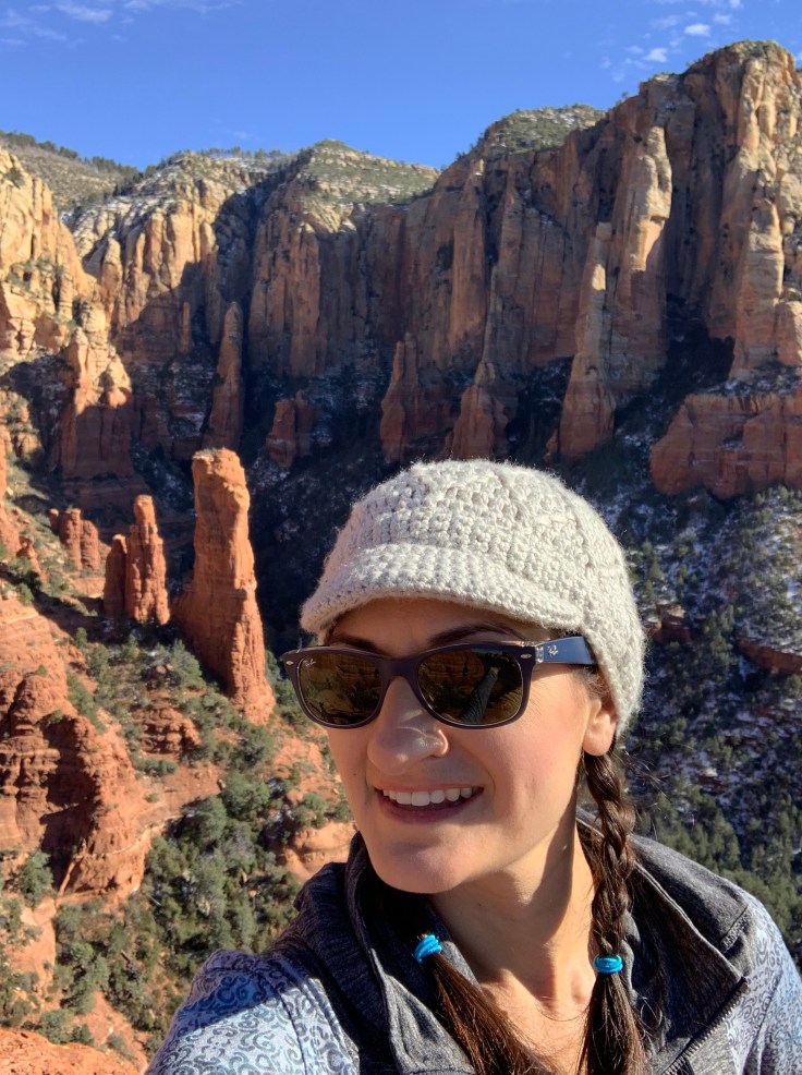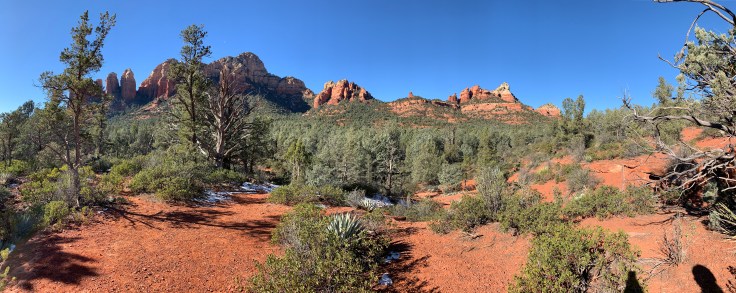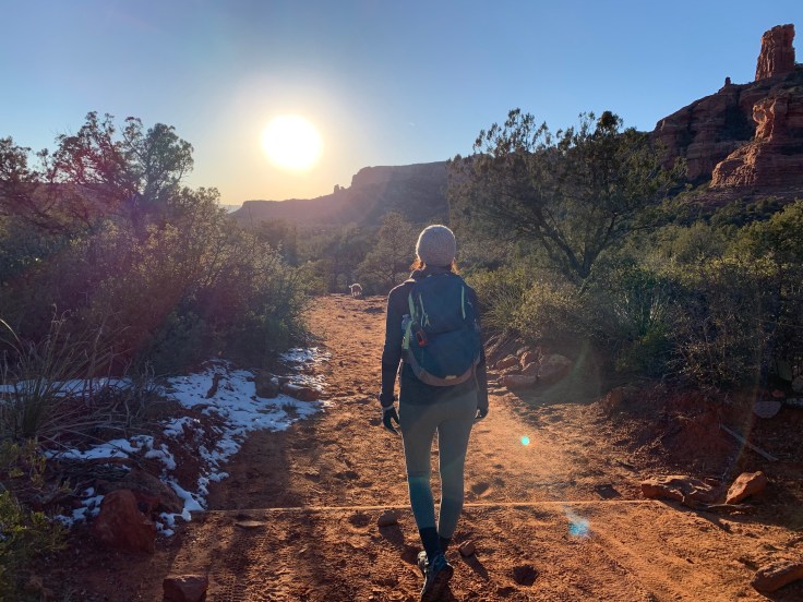 The temperature was about a cozy 35* degrees when we started our hike but with the sun shining down on the trail it was feeling warm. Warm enough to start taking off layers. I was stunned to find that I was able to strip my top half down to just the very thin long-sleeved shirt I wore today a vest. I was also stunned at the beauty of this trail. Soldiers Pass offered, yet again, a different feel from each of the other trails we’ve done this trip. Patches of snow dotted the ground and mini forests of little trees lined the path. This trail had A LOT of little side paths and alternate options, it was definitely a “choose your own adventure” type of hike. We discussed remembering those books from when we were kids.