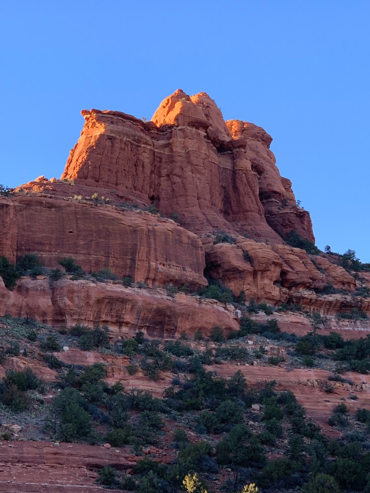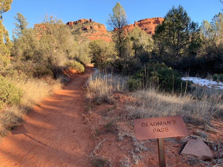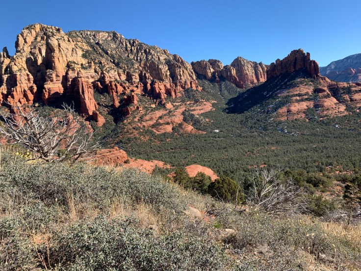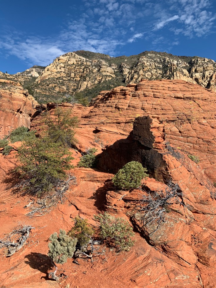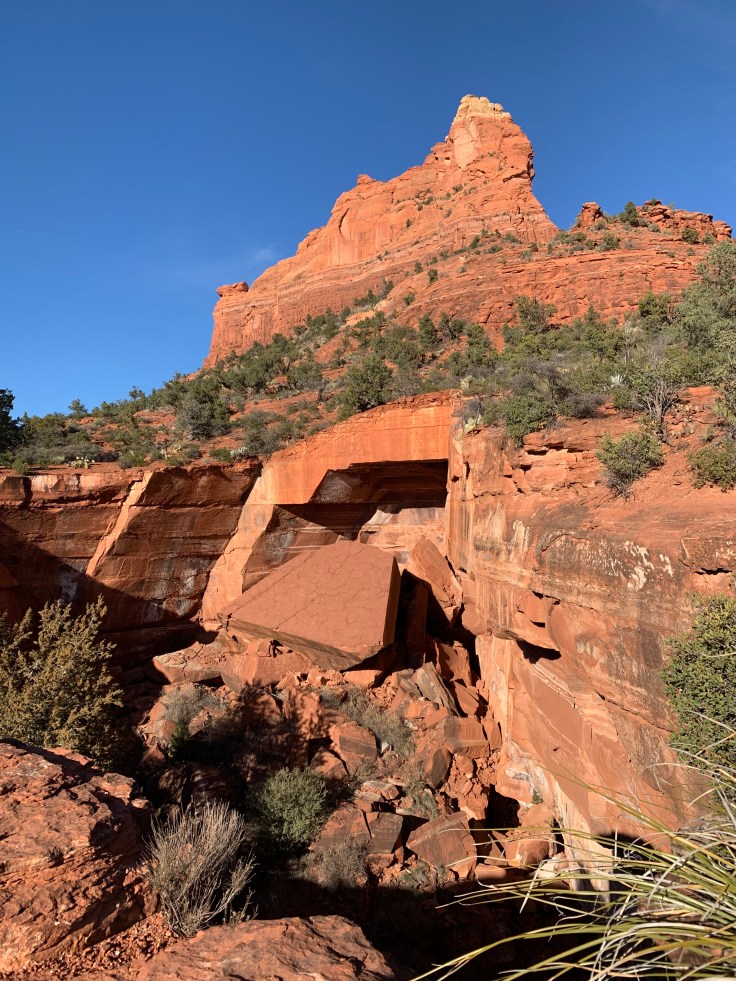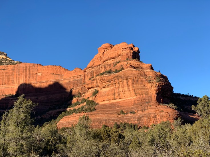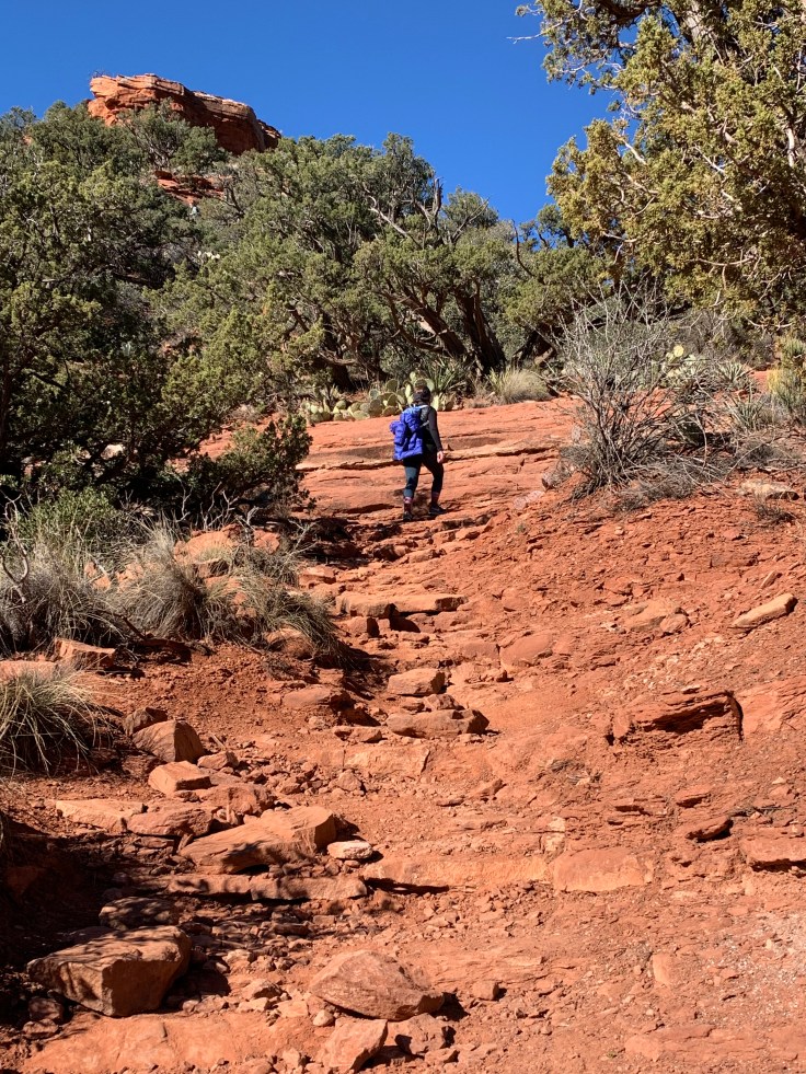 The rest of the walk back to the car from the trailhead seemed to take forever. It was 3:30pm. We had hiked 9.49 miles. We had seriously set out believing our hike would be close to half that length and done three hours sooner! That will teach us not to pack our sandwiches into our gear and take them with us. We had a car picnic while we regrouped and reconfigured our plans. We were supposed to do the Cathedral Rock Hike but there wasn’t enough time. We decided to go back to the Boynton Canyon area where we had gone with the lame guide on our first day and explore there some more. For some odd reason the GPS on my phone keeps defaulting to thinking I’m in Scottsdale every time I plug it into the charger in the car but we figured out directions and got to Boynton Canyon. The Dead Man’s Pass hike was rated easy and only 2.6 miles. We had exactly one hour to hike before we had to head to our chakra healing, so this was perfect. Off to our left, we could see the energy vortex we had visited our first day.