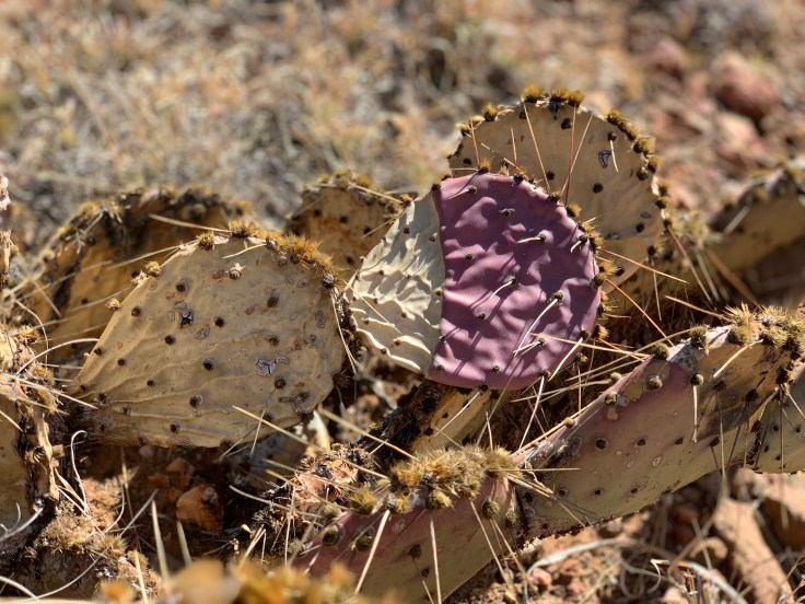 The trail started out pretty flat, which was a nice relief, across the flat mesa top we tramped on. I admired the shiny sparkling insides of broken rocks beneath my feet and pondered why some cactus was turning purple. The trail got edgy ledgy and red rocks grew larger before us, we were almost there.