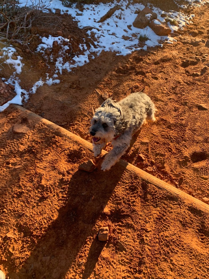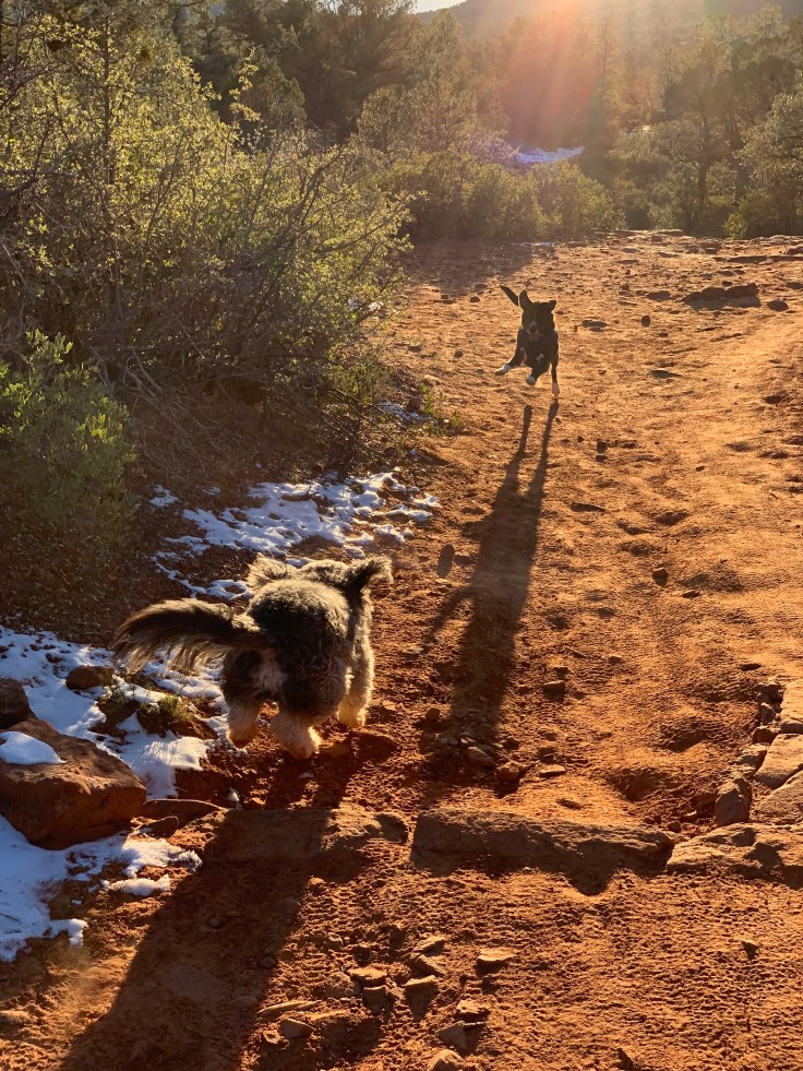 We didn’t have much time before we had to turn back but we continued on. We were happy and chattier, stopping to discuss what we saw in the rocks and taking a customary trail selfie. Jenny saw an Indian sitting in the massive stone behind us. I saw an eagle. It was time to turn around and we headed back with the setting sun striking us straight in the eyes as we discussed how glad we were to be startled by the flurry of dogs as they had definitely raised our spirits and revived us both. We were so excited to come across the dogs again as we descended the trail. Unsure why these people were going back out but we took the opportunity to love on these pups yet again.