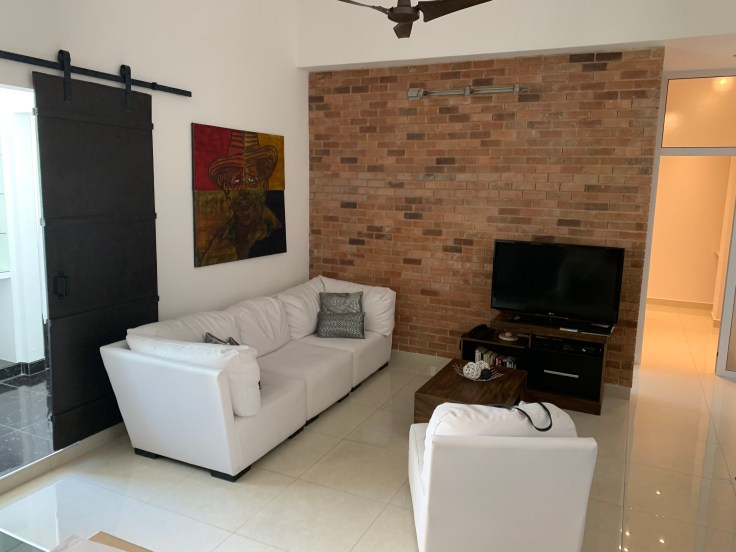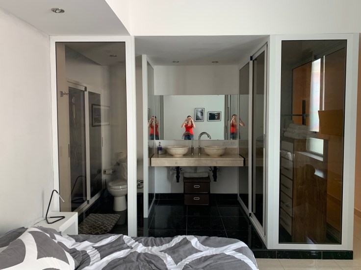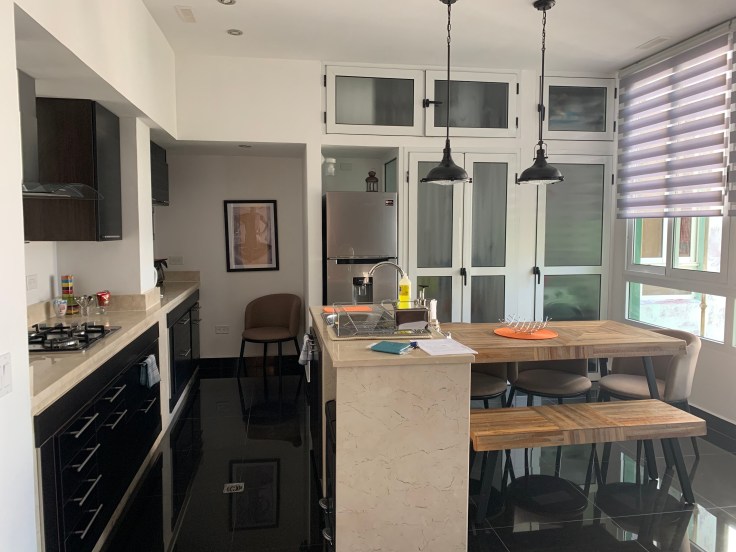 As he was on the phone I looked out the window and voila, we were parked directly in front of 255. The peeling tan and green building had rusted bars against the doors leading to an “atrium” that smelled like livestock. We are convinced that there are goats somewhere in this building though we have yet to find them. Random cats sauntered around, a moped was parked inside, and a broken cushioned chair sat by the entrance. Our host, Gladys, met us downstairs. She was a pleasant Cuban woman who spoke limited English. We were shocked, yet pleasantly surprised, that there was a pretty new elevator in the building to take us to the 6th floor. As we got out of the small contraption Gladys pointed to the first door, that was her apartment. We could always come to her for anything. As we followed her down the hallway I was practically holding my breath in anticipation of just where we would be staying. She opened the door and we were pleasantly surprised by the clean, modern, well appointed apartment. It has its quirks, like glass walls around the toilet in the master suite, but it’s a great little place.