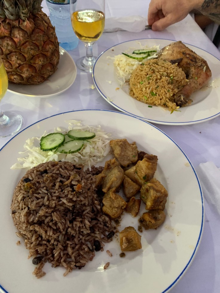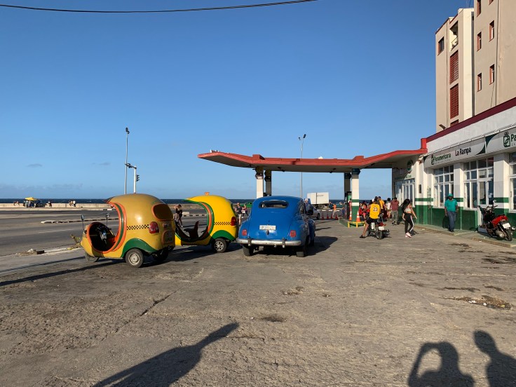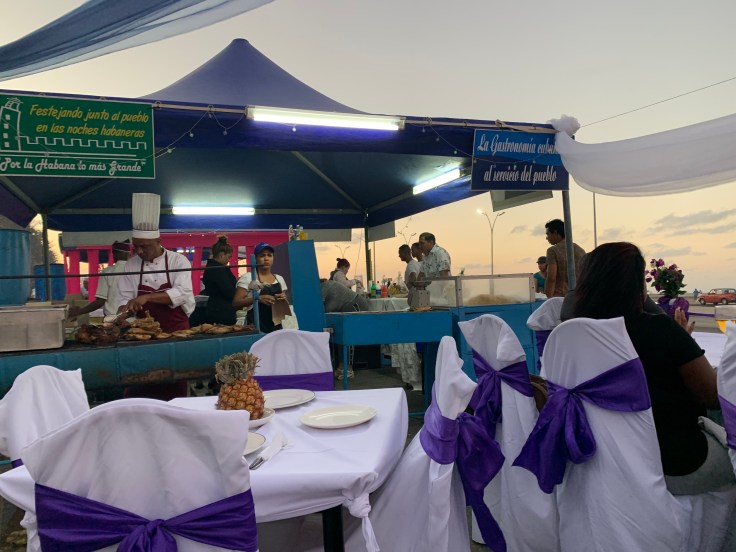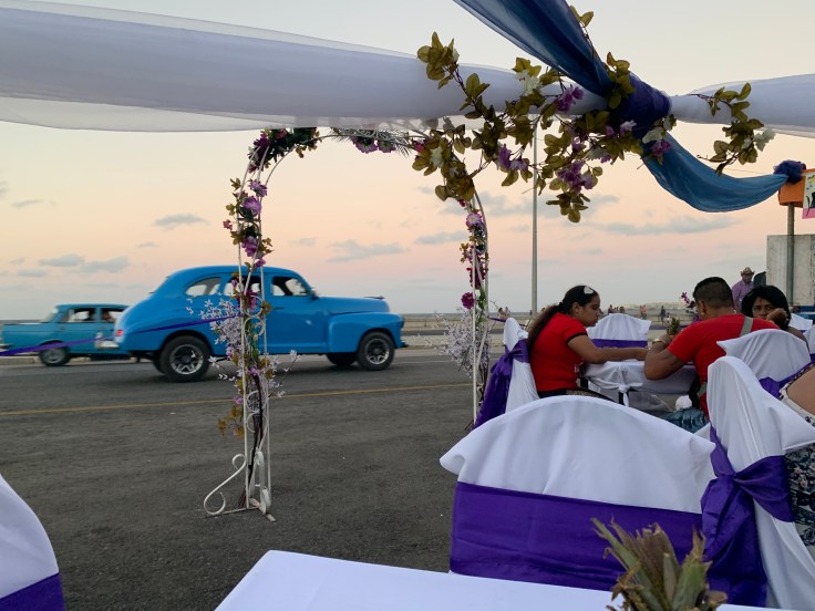 There were tents set up along the Malecon, all selling basically the same chicken or pork plates. The pricing was a confusing mix of both Cuban currencies, the CUC and the CUP. It is roughly 25 CUP to 1 CUC. Some of these tents actually had tables and chairs set up like a restaurant, yes on the highway, with table side ordering and full service. We decided to go for it. We picked one that seemed pretty well patronized by locals and got a table for two. They had few options for us. Pork or chicken? Fried rice or beans and rice? We said we’d take one of each to share. Plus one cerveza and two bottles of water. The “restaurant” setting was that of a tacky 80s wedding reception, fully covered white chairs with giant purple bows, purple and white tulle overhead, and an archway of flowers. The beer was good and the food was delicious. It was a great meal. But we were wildly overcharged. It was still a very fair price of $20 CUC (1 CUC is 1 USD) but the locals price that was posted on the board out front would have been about $4. We realized that we were for sure going to be taken advantage of here.