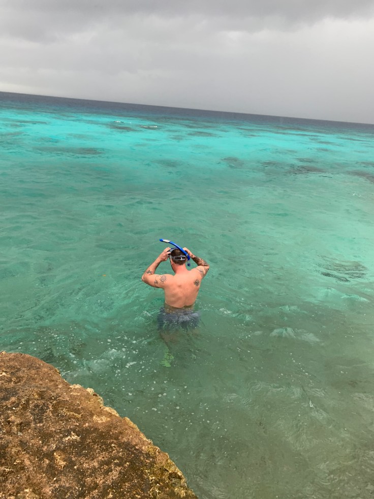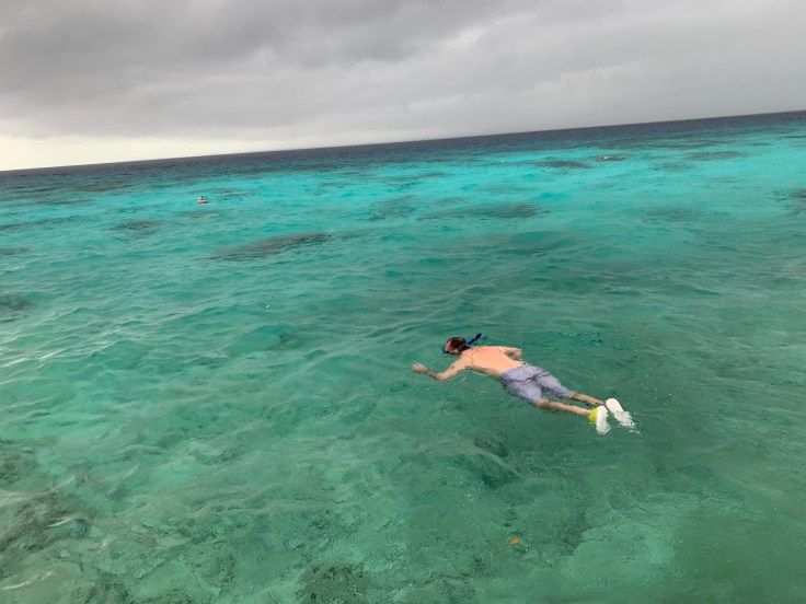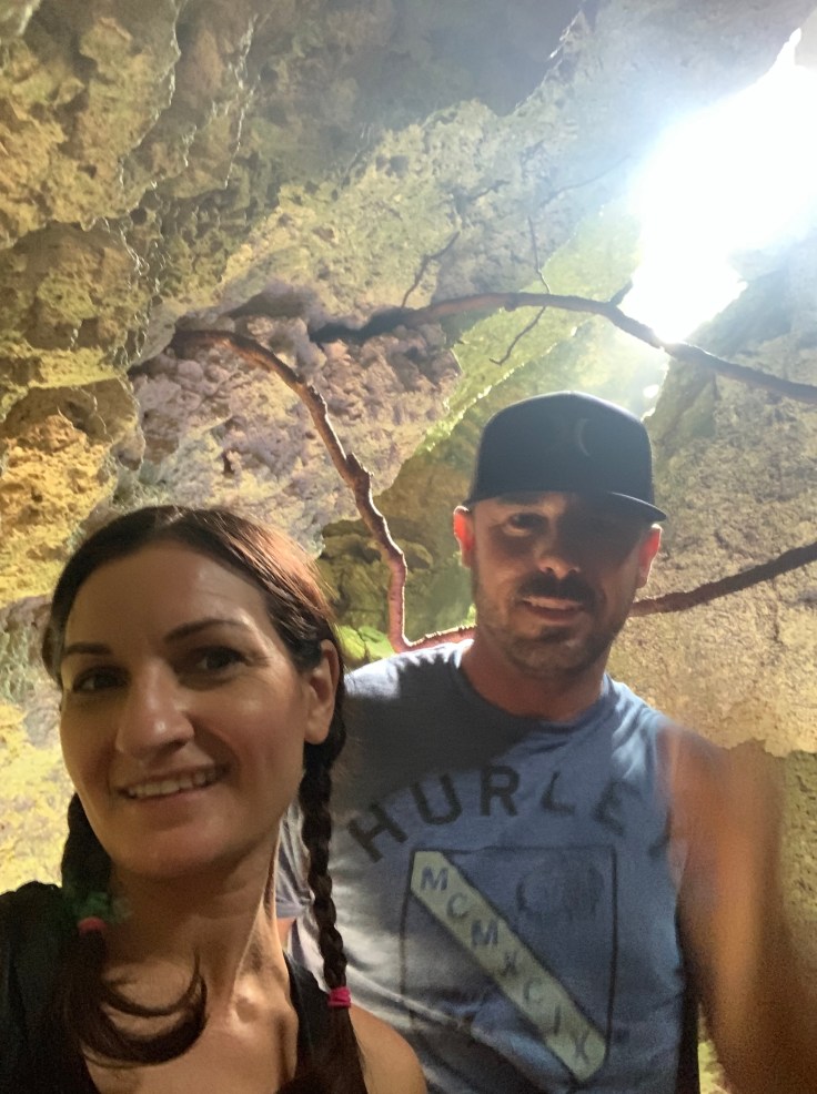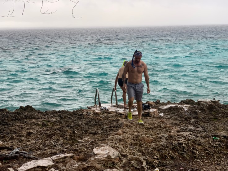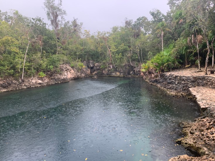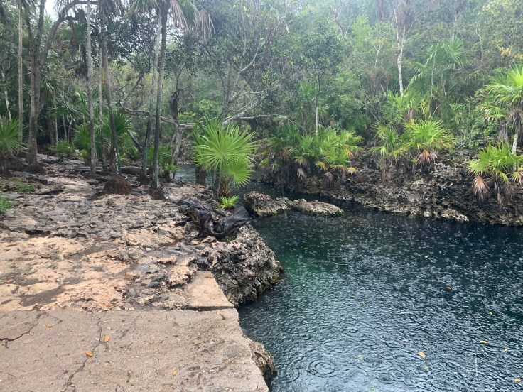 It was getting cold. I knew I probably would not get in the water at this point but Brandon was determined. We returned to the bay and I slipped into my bikini top in the back of the car. Even if I wasn’t going to snorkel, I might as well wear that out in the rain and keep my other clothes dry. It wasn’t just raining, it was windy. It was cold. We froze as we ran across the road to the bay. This was a popular snorkeling spot with a couple vendors set up along the beach. Luis followed us out and went to chit chat with some of them while I followed Brandon to the water. In he went. I dipped my toe in. So cold. Everything was cold. The rain was strong and fierce, fueled by the wind. The vendors hollered and waved me over to take some shelter alongside their stall. I sat there shivering but smiling watching Brandon float along in the beautiful bay. I felt bad that the weather was not cooperating better for him. After a few minutes, and heavier rain, he had enough and came shivering out of the water. The freshwater flooded cave was right back across the road and also was to promise great snorkeling. Brandon was too cold and done being in the water but we knew we should at least see it. So we ran across the road and hurried to find it as quickly as we could. It was pretty enough, not as pretty as the flooded cave he had swam in when it was still warm earlier in the day, but we were glad we made the stop and admired it together.