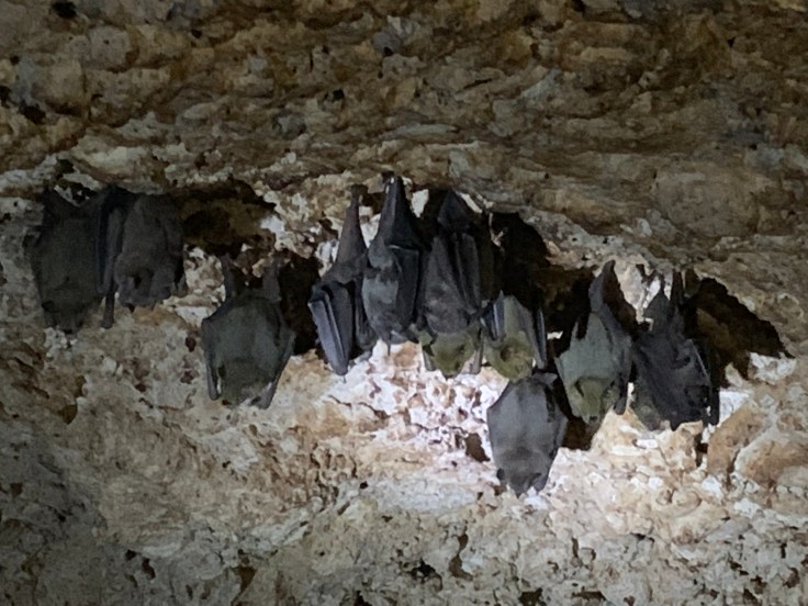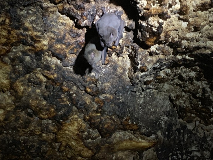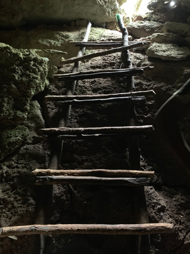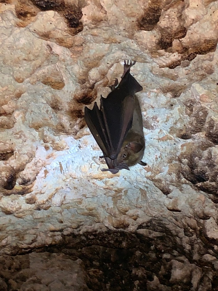 We reached the next cave where a rudimentary ladder was lashed to the side allowing easy access. As soon as I descended I could see the bats hanging overhead. I shuddered with unease. Eduardo spotted an owl roosting on a rock in the cave and shone his dim light, I could barely make it out but was excited nonetheless. I love owls! We had spotted the non-nocturnal Pygmy owl when we first parked and so now I got to see the nocturnal owl as well. I tried to figure out if I could get closer for a better view but a deep pool of water shared our space in the cave and there was no way to safely get closer. I began to relax more as Eduardo shone his light on all the bats hanging within inches of us. We could stand in this cave but with barely any clearance, so the bats were right on top of us. I didn’t mind them hanging out but still had to stifle squeals when they flew around us. These were good sized bats too, each hanging at probably 6-7″ long. Eduardo and I were failing to communicate well, I really just wanted him to shine the meager flashlight on certain clusters of bats so I could get a picture and he thought I wanted him to disturb the bats and clear them from overhead. This was a frustrating exchange. I settled more as Brandon and I discussed that some of the bats were actually kind of cute, like little teddy bears.