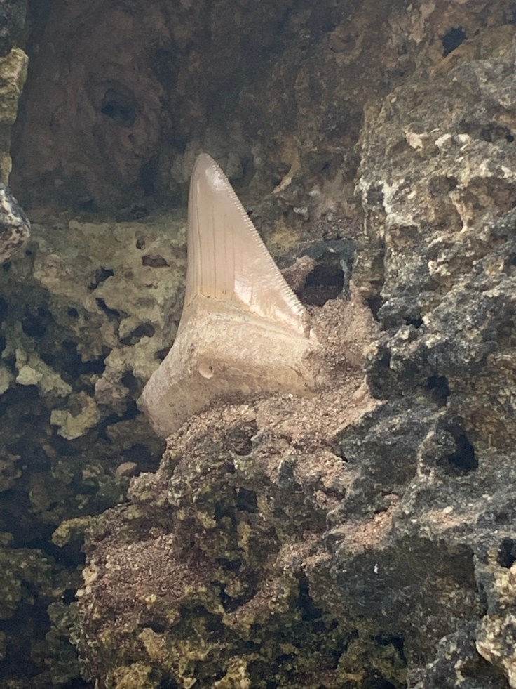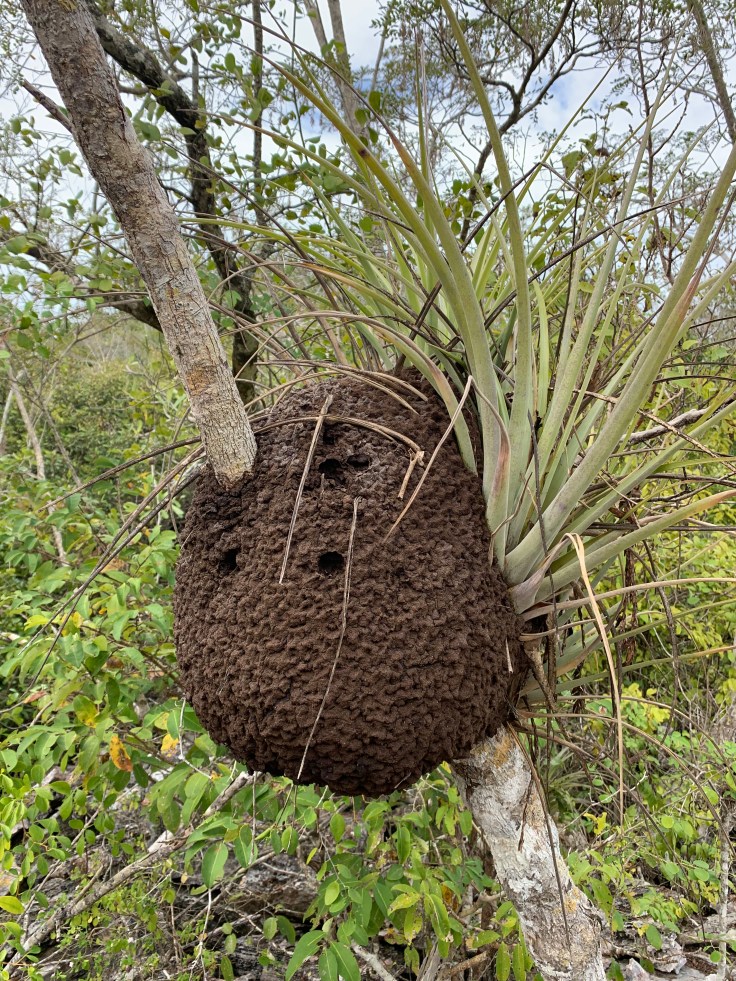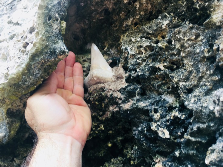 We climbed out of the cave and continued our hike, going back and forth between hiking on soft dirt, spongy with roots pushing up from below, and jagged coral riddled with deep gashes and crevices. We saw many birds and giant termite nests. We came to another crevice and Tomas explained that now we would be descending down into the tectonic fault. I’m unsure if that was actually true, I’ve been on fault lines, but whatever. As we climbed down and walked through a narrow crevice Tomas stopped us to point out all the sea life petrified into the walls around us. He then led us around the corner to where Eduardo had been waiting for us to show us one of their prides, a Megadon tooth, which they had found a couple years prior, embedded in the coral walls. I climbed up to get a closer look. Wow. But I very quickly realized that this tooth looked a little too clean and was sticking out a little too perfectly. Without asking I gently touched it. Hmm. It was clean as a whistle. And then I noticed a tiny little drill hole at the base of the tooth. I stepped down and Brandon took his turn. He was more polite and asked first if he could touch it, they warned him that it was very fragile so they prefer not but be very very gentle if he wants to. He ran his finger gently along the jagged edge. I just stared at it from below with skepticism. When we were done looking at it, they explained that Eduardo would replace a rock over it to keep it hidden so it’s not seen and stolen. This was the first time they had us lead the way on the trail and they pointed to where we should go. I am completely convinced that they planted that tooth there for us to find. First off, as we approached Tomas had held us at bay looking at other fossils while Eduardo went around the corner and then when it was time to leave they sent us up ahead. I shared my conspiracy theory with Brandon and, upon reflection, he agrees.
