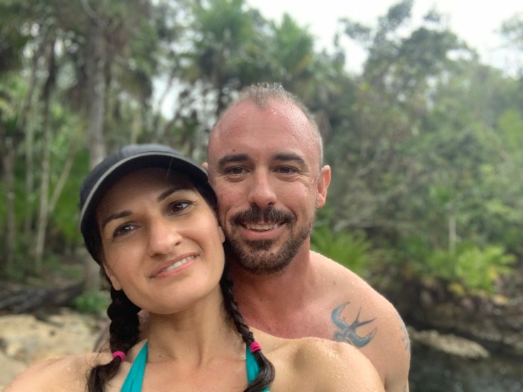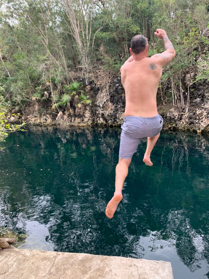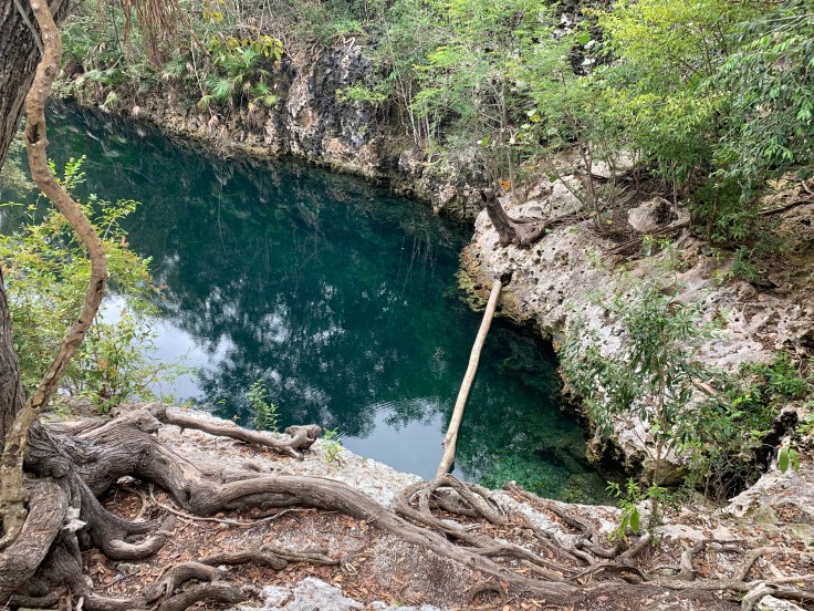 Finally we came to the deep pool of water and I realized that their use of the word cave isn’t in fact necessarily always the cave we would think about. They refer to these giant bodies of water as flooded caves. This one was indeed gorgeous but when we learned that it was 76 meters deep I knew I would be sitting this swim out as I can barely dog paddle. Brandon was all in. I watched with delight as he stripped down and dove off into the crystal clear brackish water while I happily sat back taking in the scene of him cooling off in the water. Tomas explained that Eduardo wanted to learn english and we taught him the word “brackish” while Brandon swam. After his swim it was just a short walk back out to a different part of the main road where Luis was waiting to pick us all up. I received two bug bites on this hike, both within an inch of my citronella anklet.
