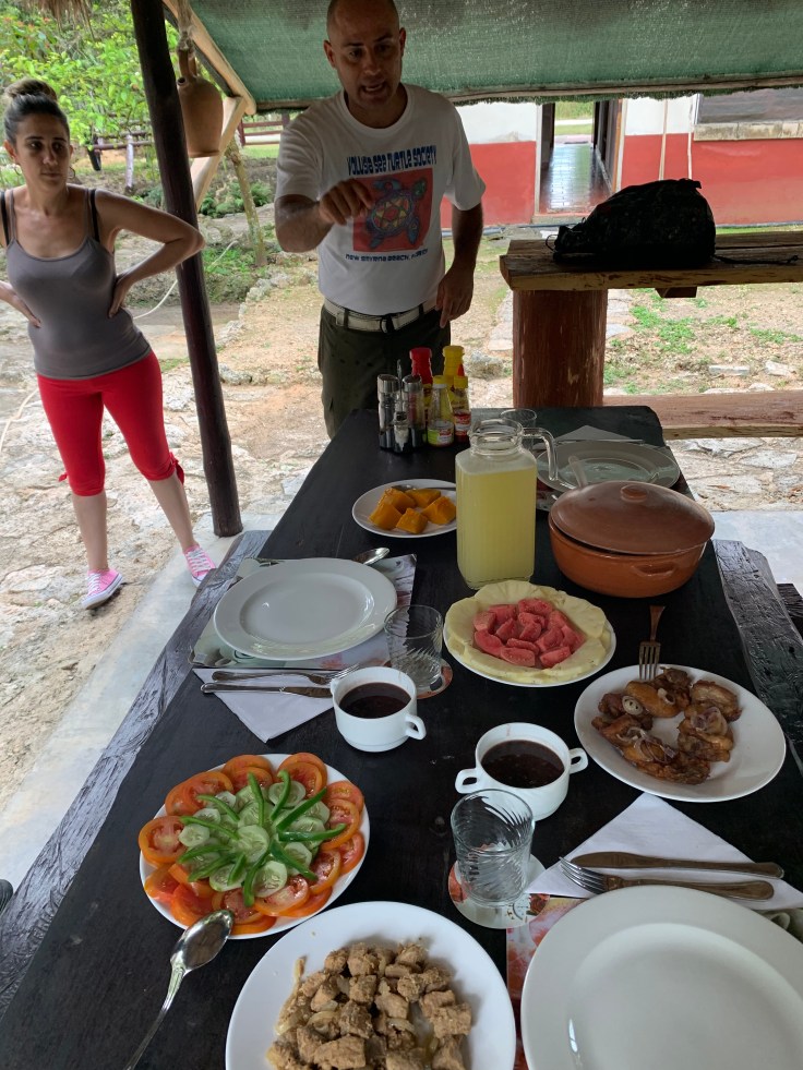 As we stood there cooing over the tree rats and talking with Eduardo’s son the rain started to fall heavier. Son excused himself as he could feel the onset of a cold and didn’t want to get sick. And wife called us to come eat as the food was now ready. There were three place settings on the table, Luis would be dining with us. I loved that, it made me so happy that our driver would be joining us instead of it feeling awkward like we were having a great meal while the local did not get to partake. I summoned up enough Spanish to say “I’m sorry, I wish I spoke Spanish and we could talk more” as he sat across the table from us. He appreciated the gesture. Our lunch was a delicious spread of black bean soup, rice, chicken, pork, pumpkin, vegetables, and fruit. And the most divine freshly squeezed pineapple juice ever. The pineapples we’ve had in Cuba don’t have nearly as much acid as the ones in the US. We stuffed our faces while the rain poured harder. Between a full belly from the meal and the now pouring rain it was sure to make the next stop of our day, snorkeling, a little more interesting. As the rain subsided, we thanked our gracious hosts and followed Luis back out to the car.