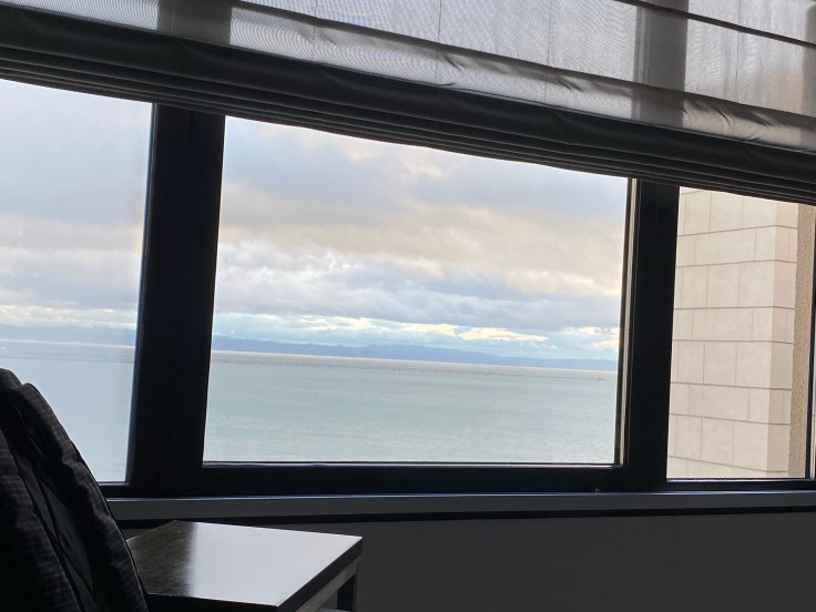 Our first hotel of the trip was the Marriott Waterfront SFO. I’ll give them high marks for convenient location, updated rooms (the shower was fully operated by an electronic pad!), and giving us our first ocean/bay view of the trip (with the end of the SFO runway thrown in). But super low marks because on the way there I called to confirm that our room was feather-free, was told that it was and that, in fact, most of the rooms there are feather-free, and yet lo and behold, feather pillows on the bed (I always double-check these days since I swear hotels have been getting worse and worse about honoring that allergy). We had the proper bedding brought up and prepared to hit the hay and get some rest.