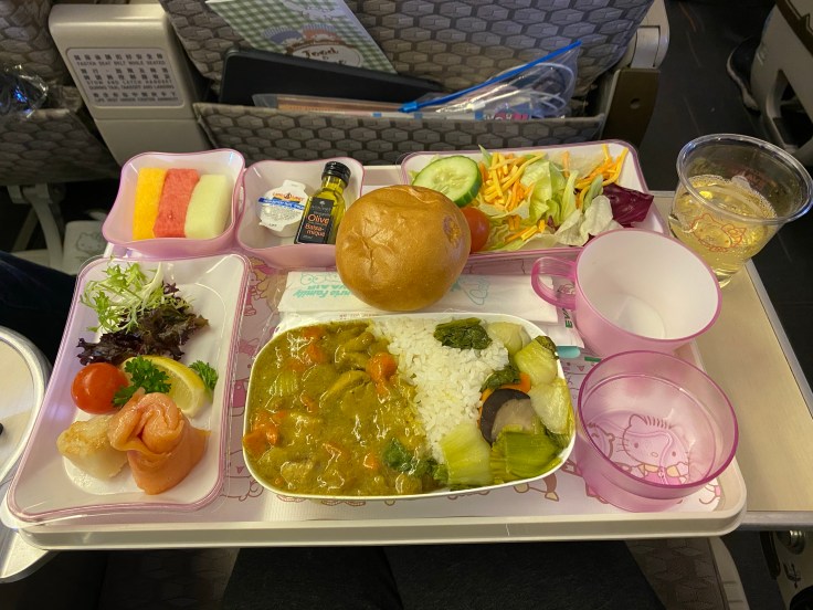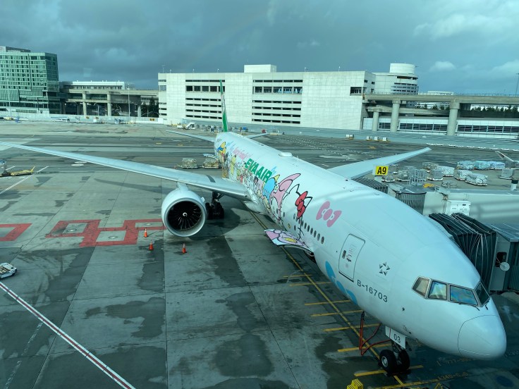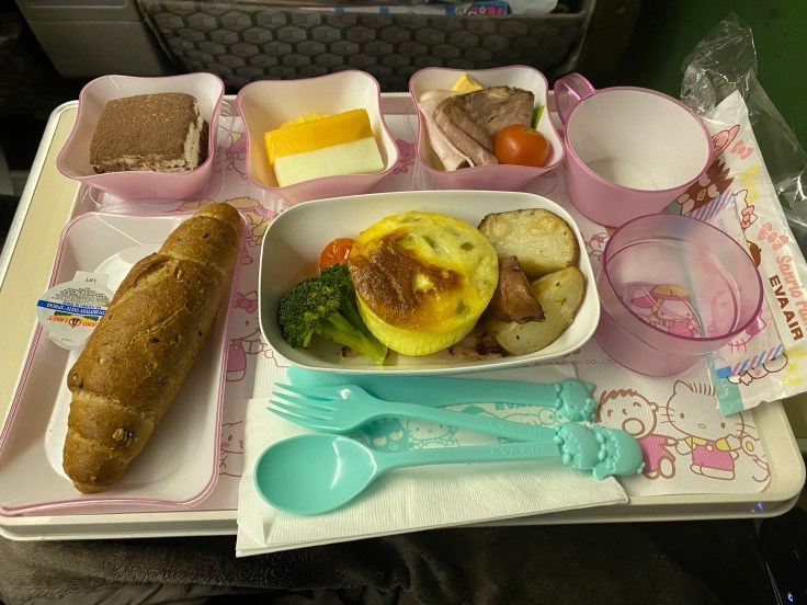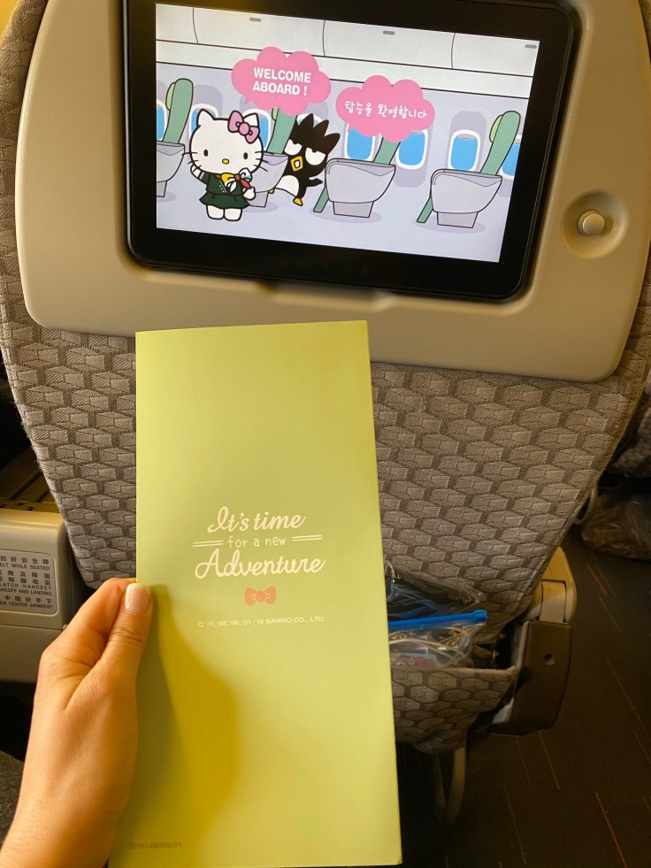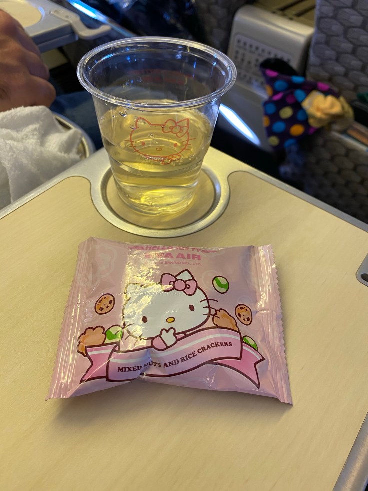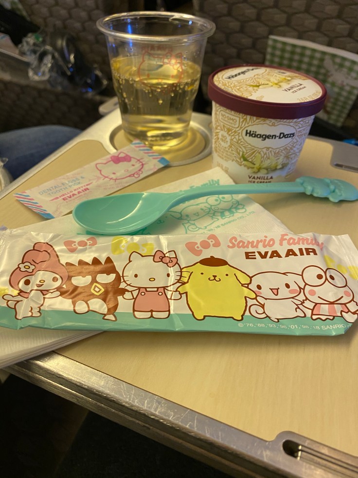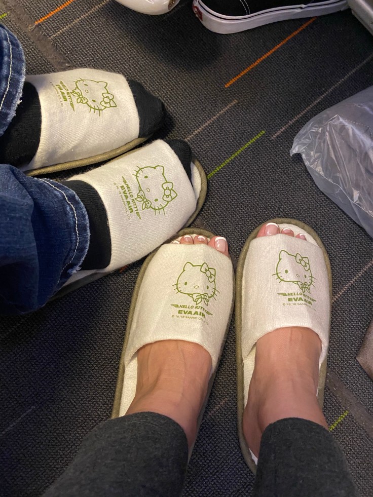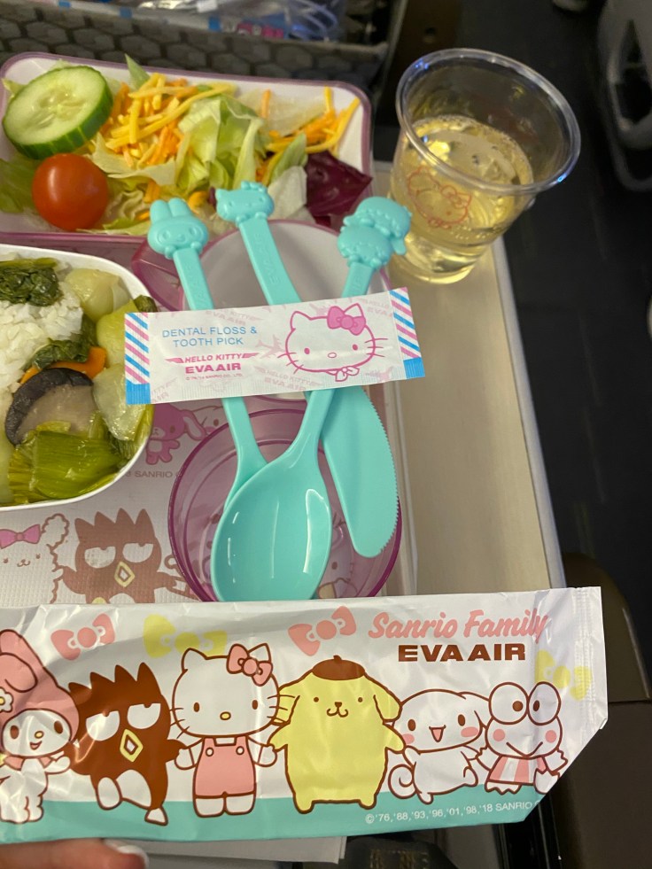 I know better than to fly basic economy on a long-haul flight, and the business class is ridiculously priced, so we flew Premium Economy class from SFO to Taipei. EVA Airlines does a really solid job. You may not recognize the airline name but you may have heard of the Hello Kitty airline, this is it. And boy do they take this theme seriously! Everything is Hello Kitty branded, from the paint job on the plane itself, to the pillows, slippers, napkins, food trays, even the utensils. It gave me Sanrio flashbacks to the 90s.