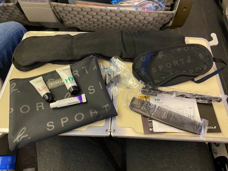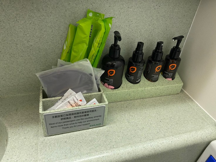 The rest of the EVA Air Premium Economy amenities were pretty decent. I did love that they gave us slippers for the flight, we wore them the entire time. They also included a little amenities kit with socks, toothbrush/paste, lotion, chapstick, earplugs, and a sleep mask. Plus the bathroom, though super tiny, was stocked with toothbrushes, ear plugs, sleep masks, lotion, face spray, and body spray. Now what the hell is the deal with people and airplane bathrooms?! It is downright ridiculous how much time some people spend in there. At one point Brandon was waiting and someone was literally in there for over 20 minutes. Over 20 minutes! I just don’t understand that. I spent waiting time doing yoga in the aisle to stretch and I’m pretty sure I got in a solid hour of yoga time over the course of the flight just in bathroom waiting time!